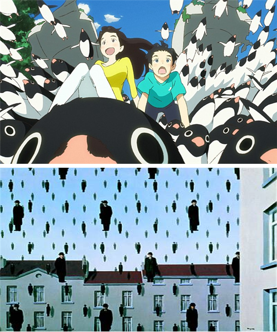 그밖에도 영화 후반부에서 티 없이 맑은 하늘을 배경으로 수십, 수백 마리의 펭귄들이 떠오르듯 표현된 이미지는 마그리트의 유명한 <골 콩드>를 연상시킨다. 실은 영화 속 '바다'의 모습도 역시 마그리트의 대표작 <피레네의 성>의 초현실적 이미지에서 참고한 것이 아닐까 싶을 만큼 유사한데, 이미 익숙한 미학적 개념과 이미지들이 연이어 등장한 탓에 그리 놀랍지는 않다.
