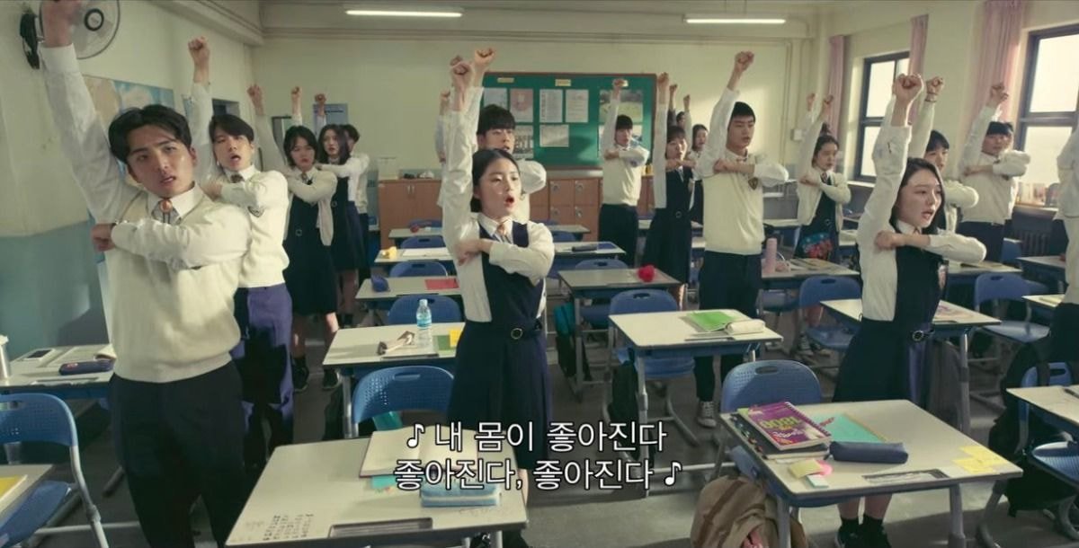 <보건교사 안은영>은 주인공 안은영이 근무하는 목련고등학교의 아침 체조 장면으로부터 시작된다. 일명 '내 몸이 좋아진다' 체조. 원작에는 없는 이 체조가 시리즈의 서두에 배치됨으로써 얻는 효과는 분명하다. 관객은 이 장면을 통해 학교에 깔려있는 어둡고 음산한 무언가를 감지하게 된다. 체조에 동원되는 구호와 정반대로, 광신적이고 건전하지 못한 정서(또는 존재)가 도사리고 있음이 불안하게 암시되는 것이다. 또한 다분히 오싹하고 컬트적인 냄새를 풍기기도 한다. 그건 이제부터 벌어질 모든 기이하고 엽기적인 사건의 배경이 다름 아닌 '학교'라는 데에서 오는 익숙한 아이러니 때문일 것이다.