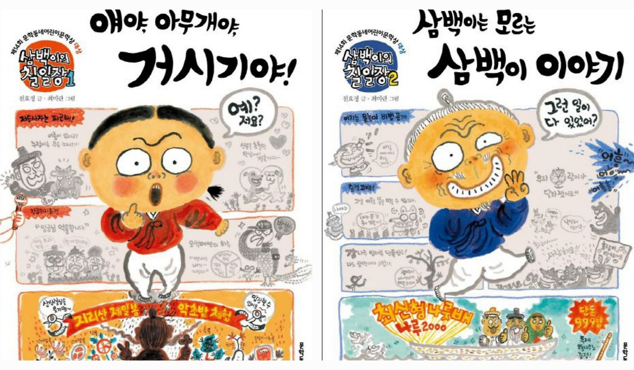 합본이 출간되면서 '삼백이의 칠일장'이라는 제목도 더 눈에 띄게 되었습니다. 원래는 각 권의 부제가 책 표지에 큰 글씨로 적혀 있었거든요. 1권의 부제는 '얘야, 아무개야, 거시기야!'이고, 2권의 부제는 '삼백이는 모르는 삼백이 이야기'입니다. 각 권의 표지 디자인은 이렇습니다.