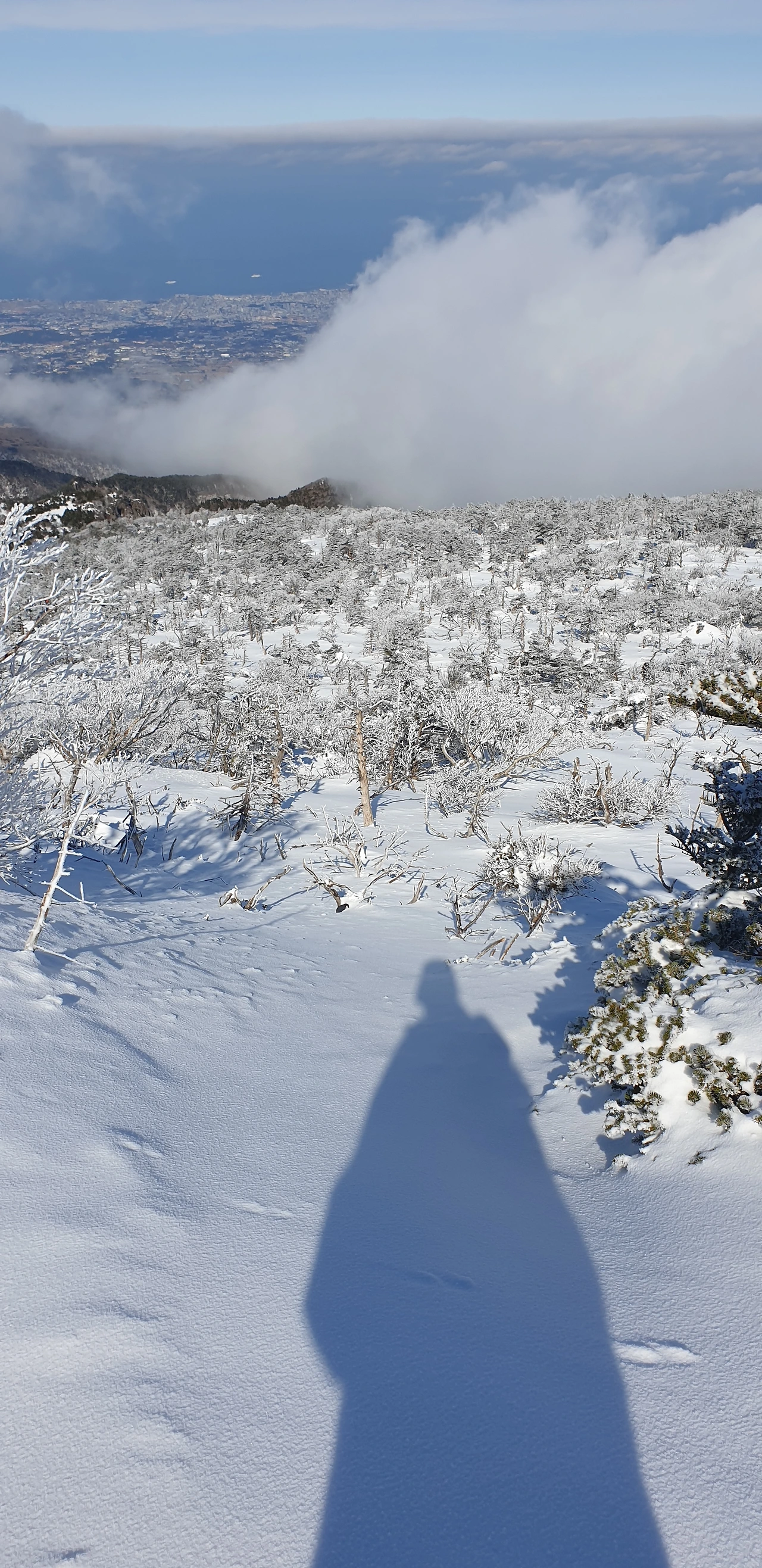 절경에 감탄하며 한 발짝씩 눈 위의 무거운 발걸음을 떼기를 여러 번. 산을 가장 잘 타는 친구가 지금은 벌써 12시 10분이니 서둘러 정상으로 올라야 한다고 했다. 백록담에는 1시 30분까지 올라야 했다.