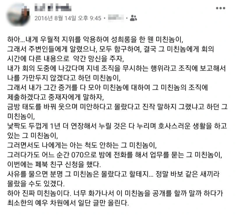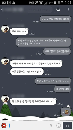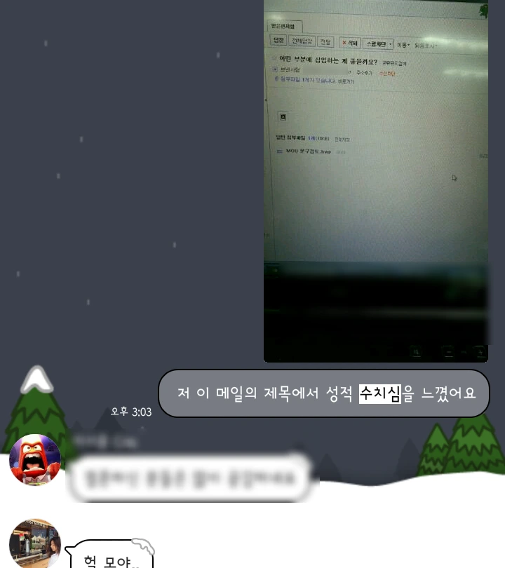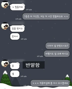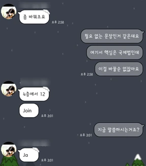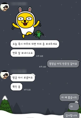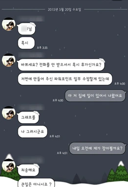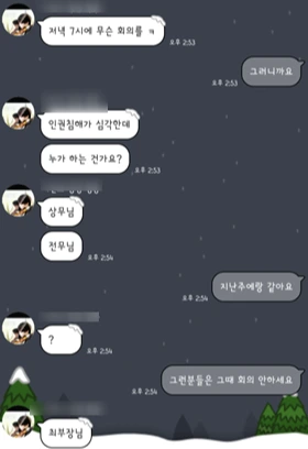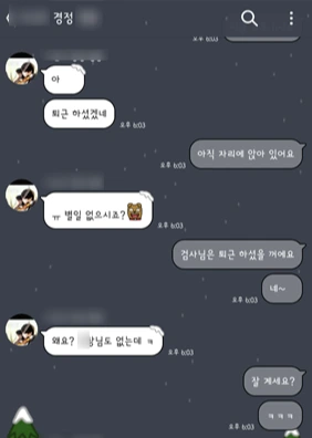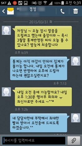 경정의 모든 행동은 여자, 계약직, 게다가 사업자로 들어와 있는 갑을관계 대상자에 대한 기만임. 쓸데없는 회의, 독촉, 연락 등과 같이 업무적으로, 그리고 유해한 메시지를 보내며 반응을 떠보는 등의 행동은 대부분 약자에 대한 기만으로 여겨졌음. 증빙 자료로 이 모든 자료를 경찰 측에 제출하고 징계를 요청하고자 함.