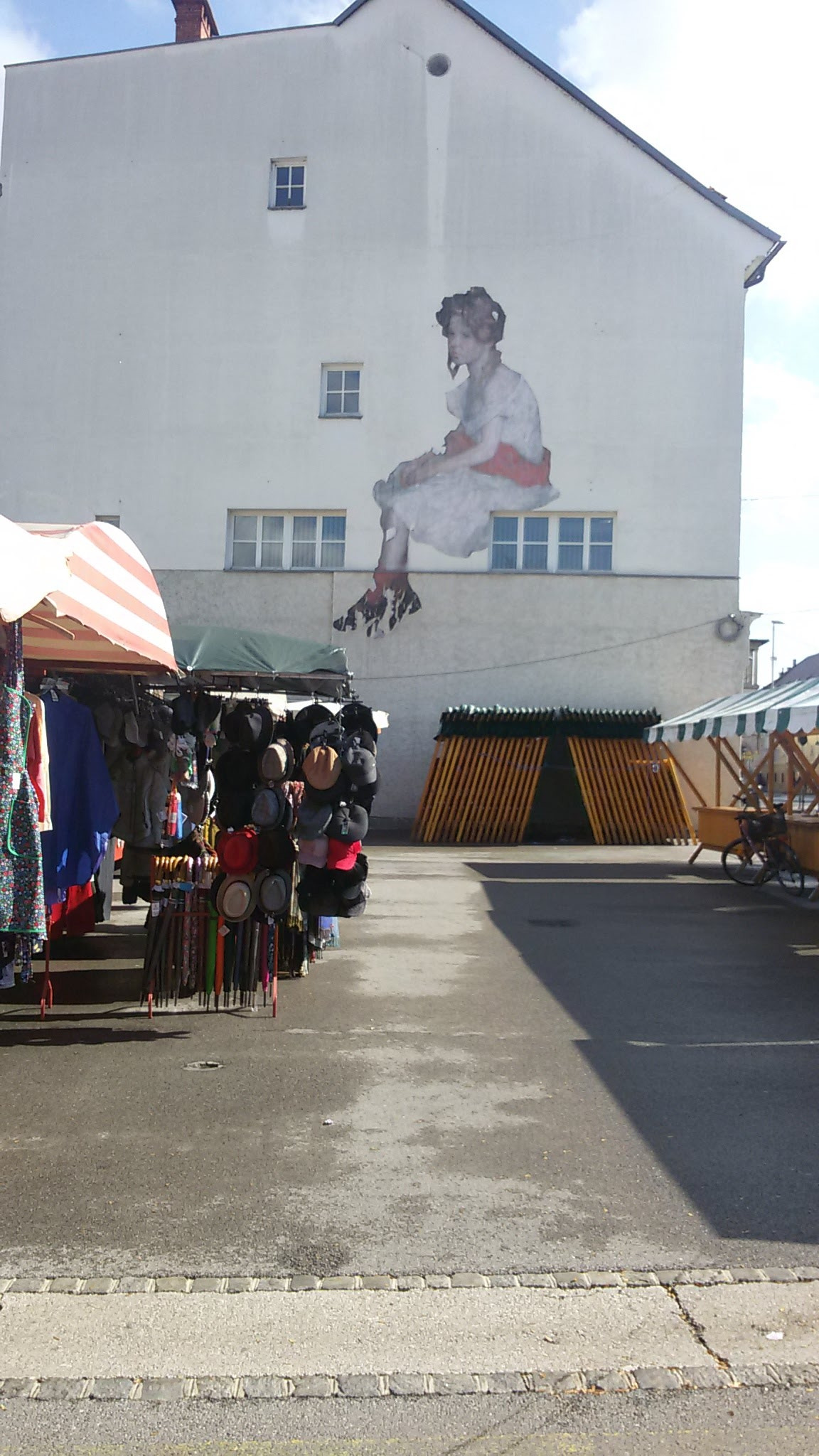 시장이 열리는 옆 건물벽의 센스있는 그림.