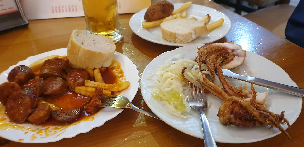 첫날 저녁때 도착해서 짐만 풀고 바로 1분 거리에 있는 유명 타파스집으로 갔다. 그라나다는 맥주나 와인, 음료 한 잔을 시키면 잔당 무료 타파스를 한 접시씩 준다. 맥주 두 잔을 시키고 타파스를 두 개 골라 주문하면서 옆테이블에서 먹는건 뭐냐고 물어봤더니 초리쪼라고 한다. 약간 말린 소시지 같은건데 우린 별로 좋아하지 않아서 딴 걸 두 개 골랐다. 그런데 초리쪼를 가져다 준다. 우리 이거 안시켰다고 했더니 "for you" 한다. 그리고 우리가 시킨 두 접시가 또 나왔다. 다른 집은 안가봐서 비교는 못하겠지만 타파스가 양이 많다. 몇년전 왔을 때 네르하에서 먹은 타파스는 식어빠지고 양도 적었었는데, 여긴 튀김도 바로 튀겨 나오고 음식들이 다 바로 조리해서 신선하다.