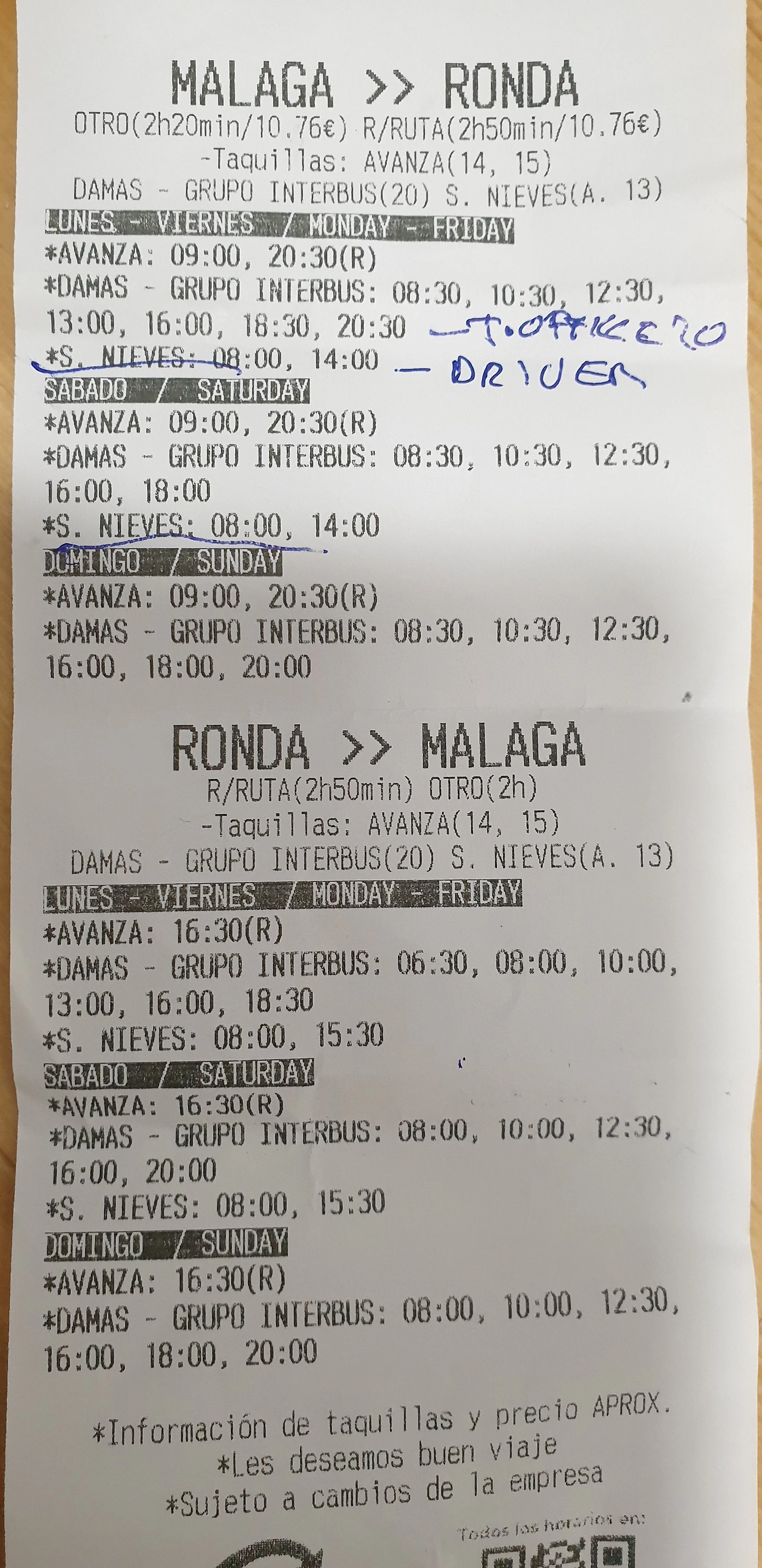 말라가에 내리자마자 터미널 안내창구에 문의해서 받은 론다 가는 버스 시간표. 알사버스가 아니고 인터버스. 매표창구가 닫혀 있을땐 기사에게서 표 구입 가능.