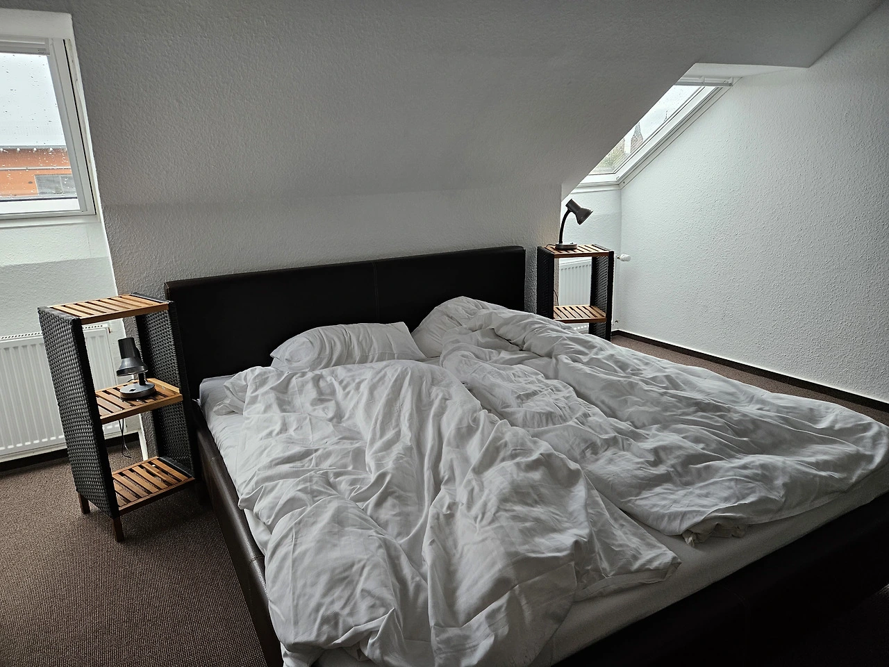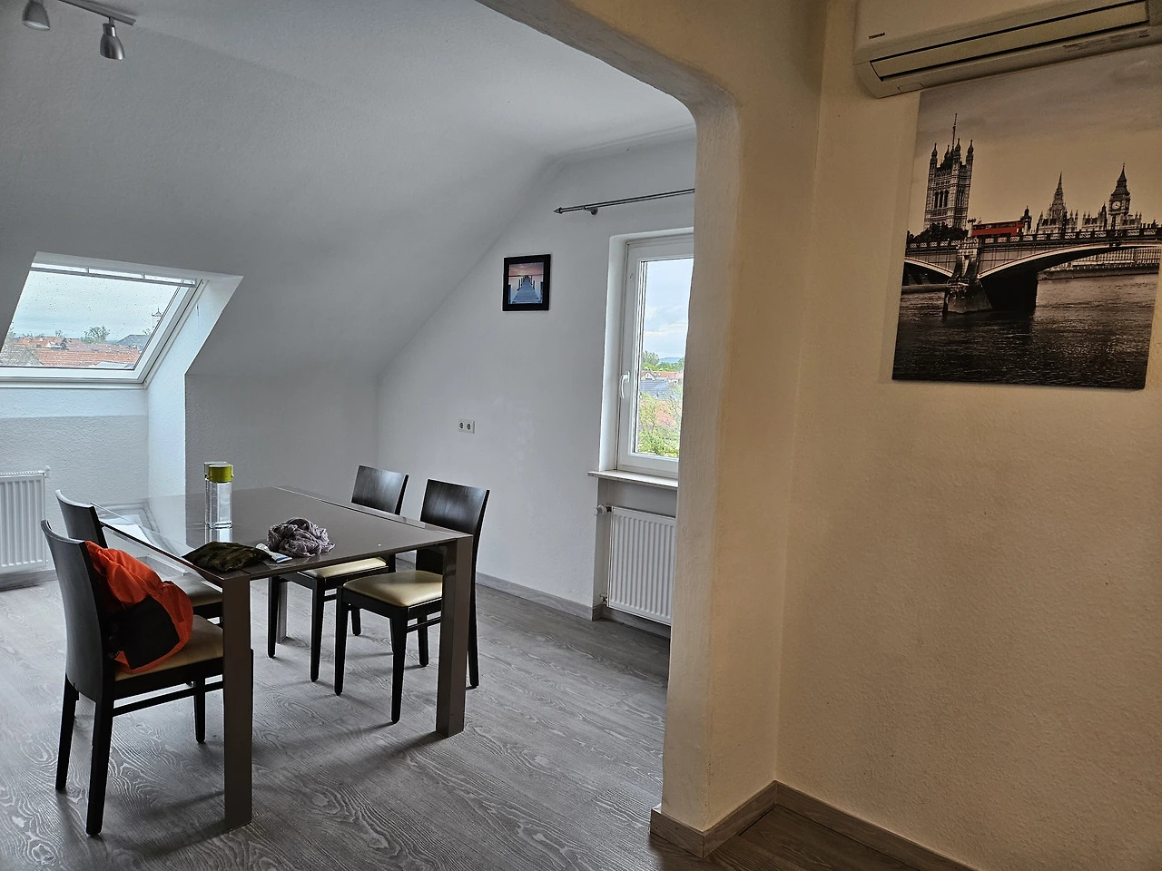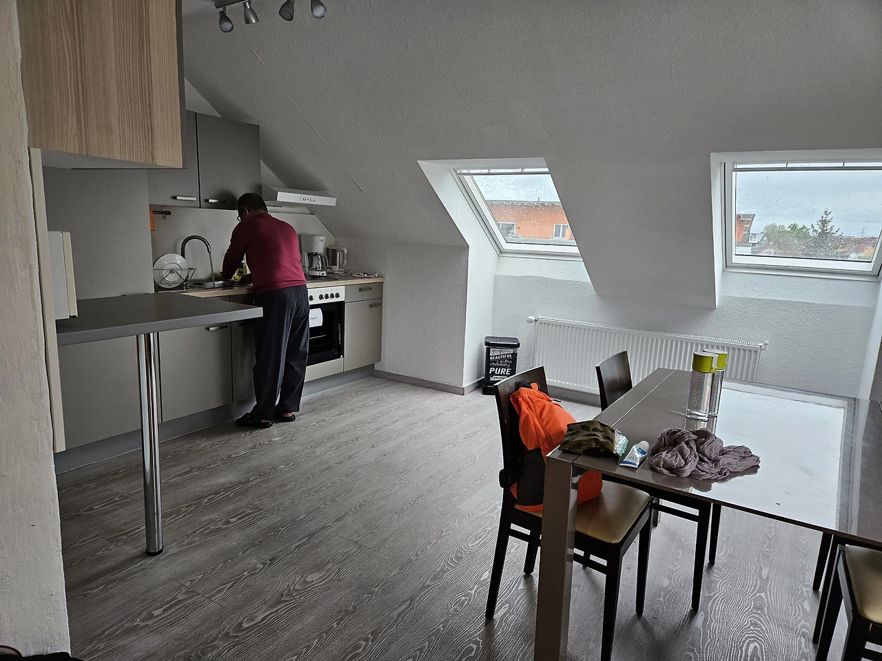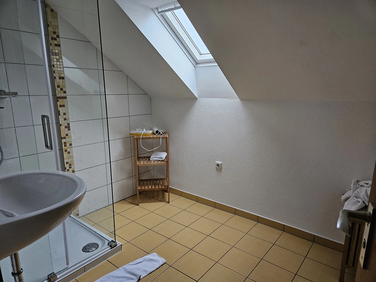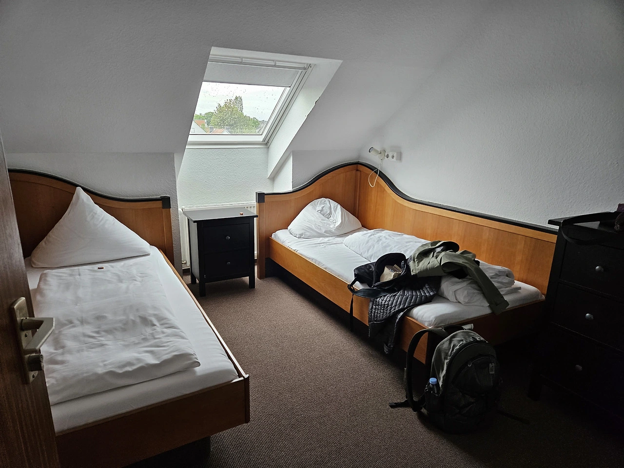 호텔은 러시아인이 경영하는데 독일어밖에 영어를 전혀 못하는 아줌마가 있었다. 어쩐 일인지 번역앱도 잘 되지 않아서 결국 아줌마 가 남편에게 전화해서 영어로 통화하게 해주어 해결하였다. 맨 위 4층에 전층을 다 사용하는 넓은 아파트먼트 인데 지붕의 경사면을 이용한 집으로 , 작은 동네 주택가에 있다.