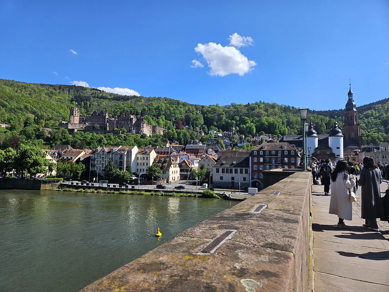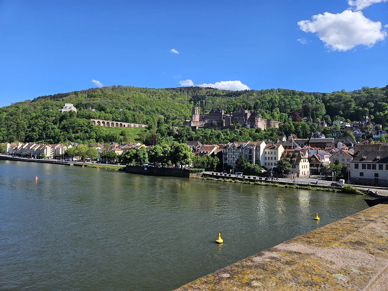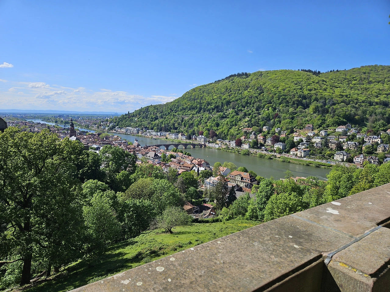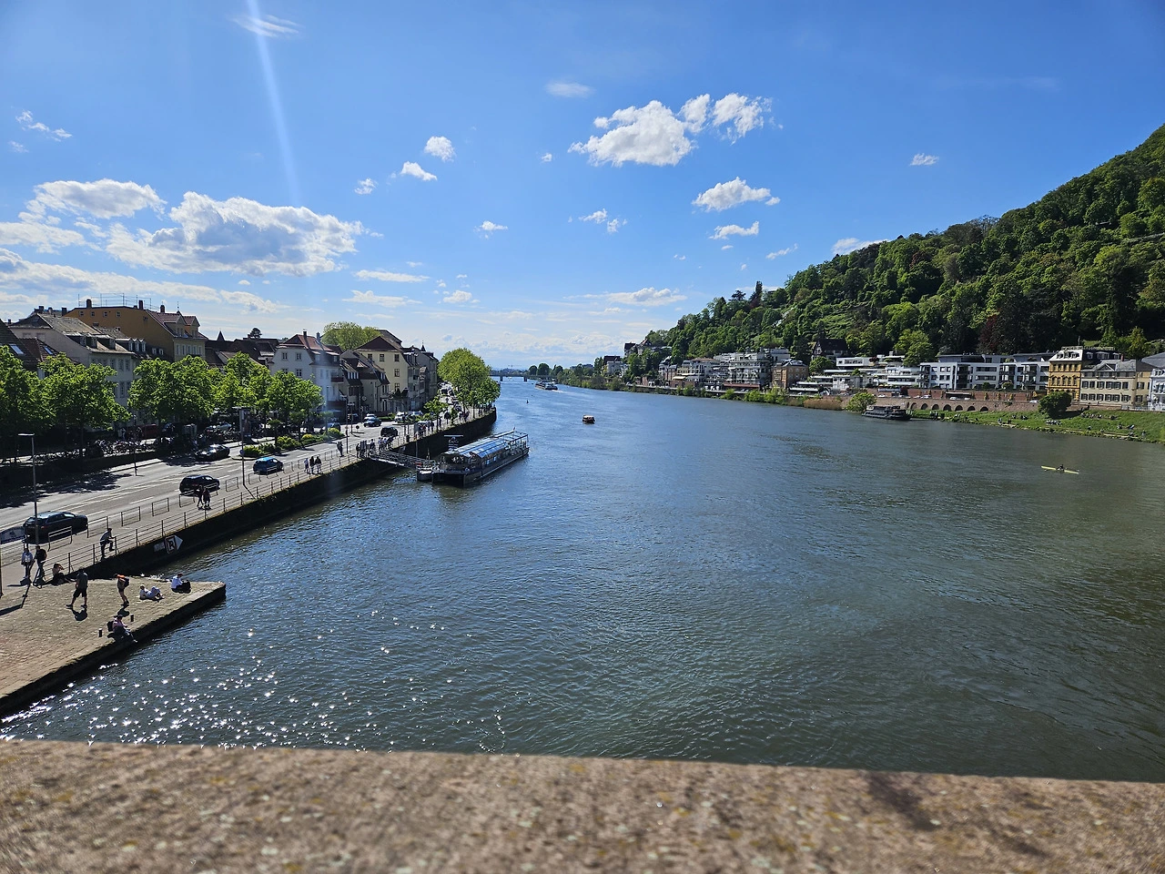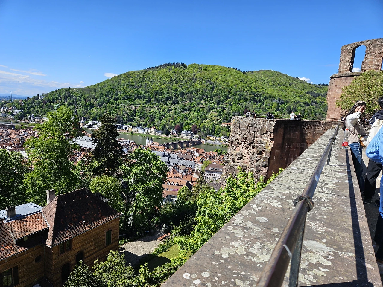 숙소가 있는 Waldbrunn이라는 작은 시골 마을에서 하이델베르크 성까지는 50분 거리이다. 하이델베르크로 가는 길은 강 따라 양쪽 기슭으로 집들이 죽 늘어서 있어 아름답다. 강에는 유람선도 있고 화물을 실은 기다란 배도 떠 있다. 하이델베르크에 도착해 P12이라는 주차장에 주차했다. 토요일이라 주차장이 만차로 언덕길에 골목에서 기다리고 있다가 한 대 나오면 한 대 들어갈 수 있다. 그런데 생각보다는 바로 들어갈 수 있었다. 주차장이 언덕 위에 있어서 아래로 내려오면 그 건물의 1층이 바로 푸니쿨라 탑승장이다.