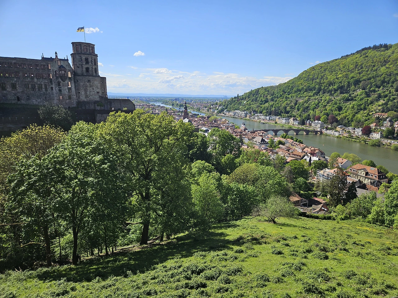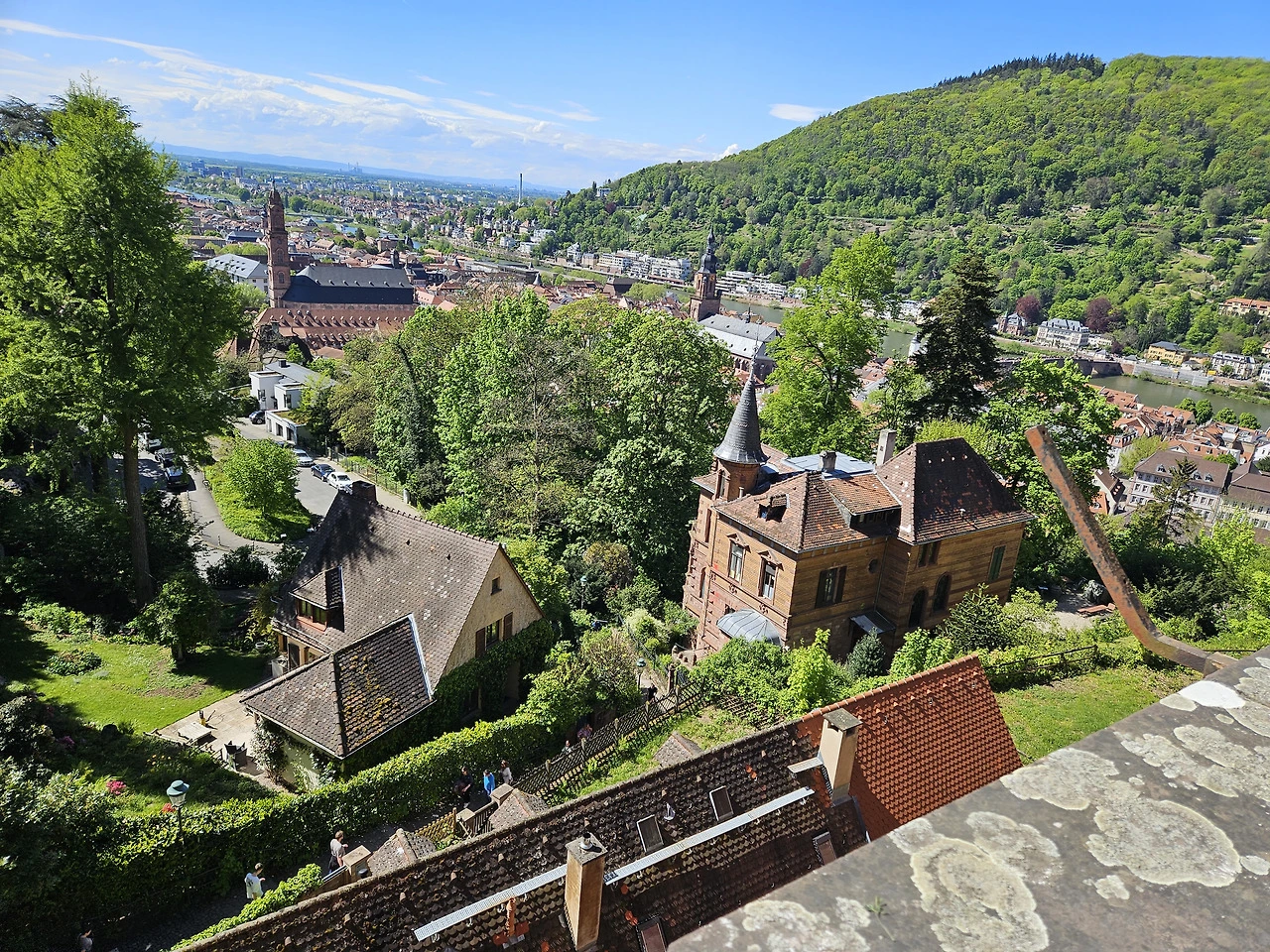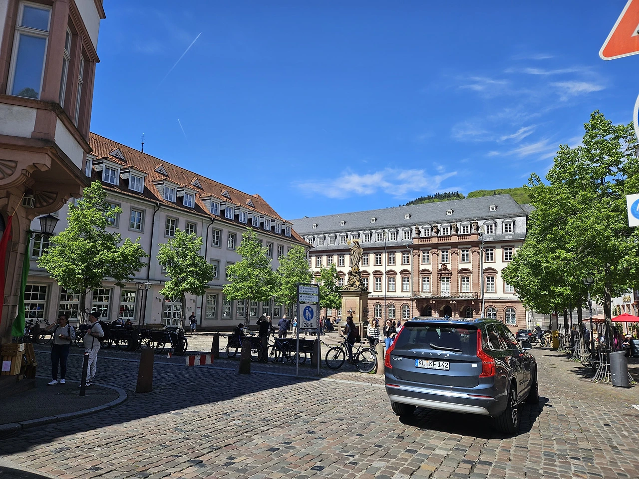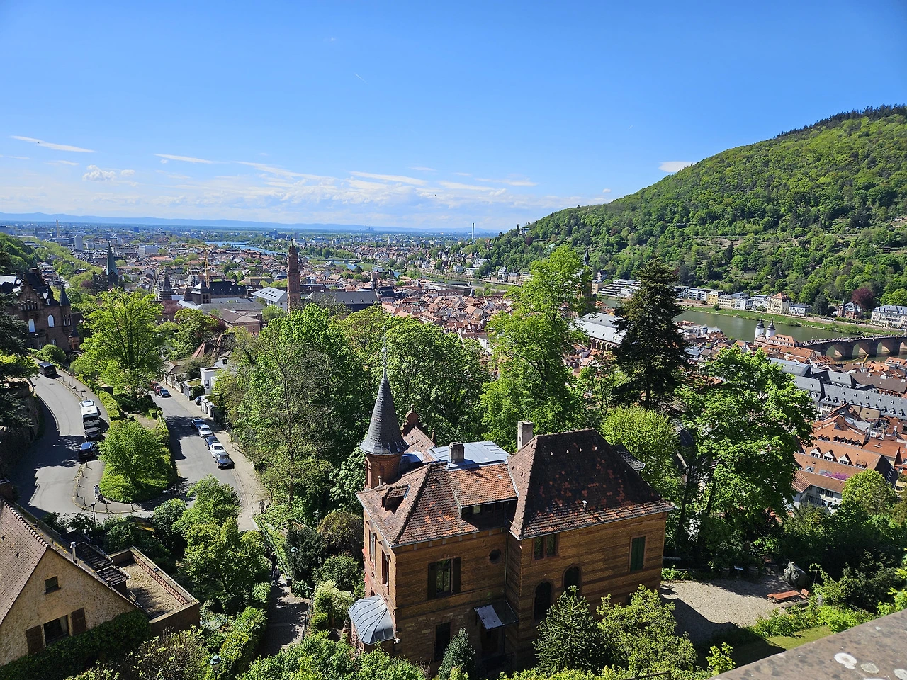 숙소가 있는 Waldbrunn이라는 작은 시골 마을에서 하이델베르크 성까지는 50분 거리이다. 하이델베르크로 가는 길은 강 따라 양쪽 기슭으로 집들이 죽 늘어서 있어 아름답다. 강에는 유람선도 있고 화물을 실은 기다란 배도 떠 있다. 하이델베르크에 도착해 P12이라는 주차장에 주차했다. 토요일이라 주차장이 만차로 언덕길에 골목에서 기다리고 있다가 한 대 나오면 한 대 들어갈 수 있다. 그런데 생각보다는 바로 들어갈 수 있었다. 주차장이 언덕 위에 있어서 아래로 내려오면 그 건물의 1층이 바로 푸니쿨라 탑승장이다.
