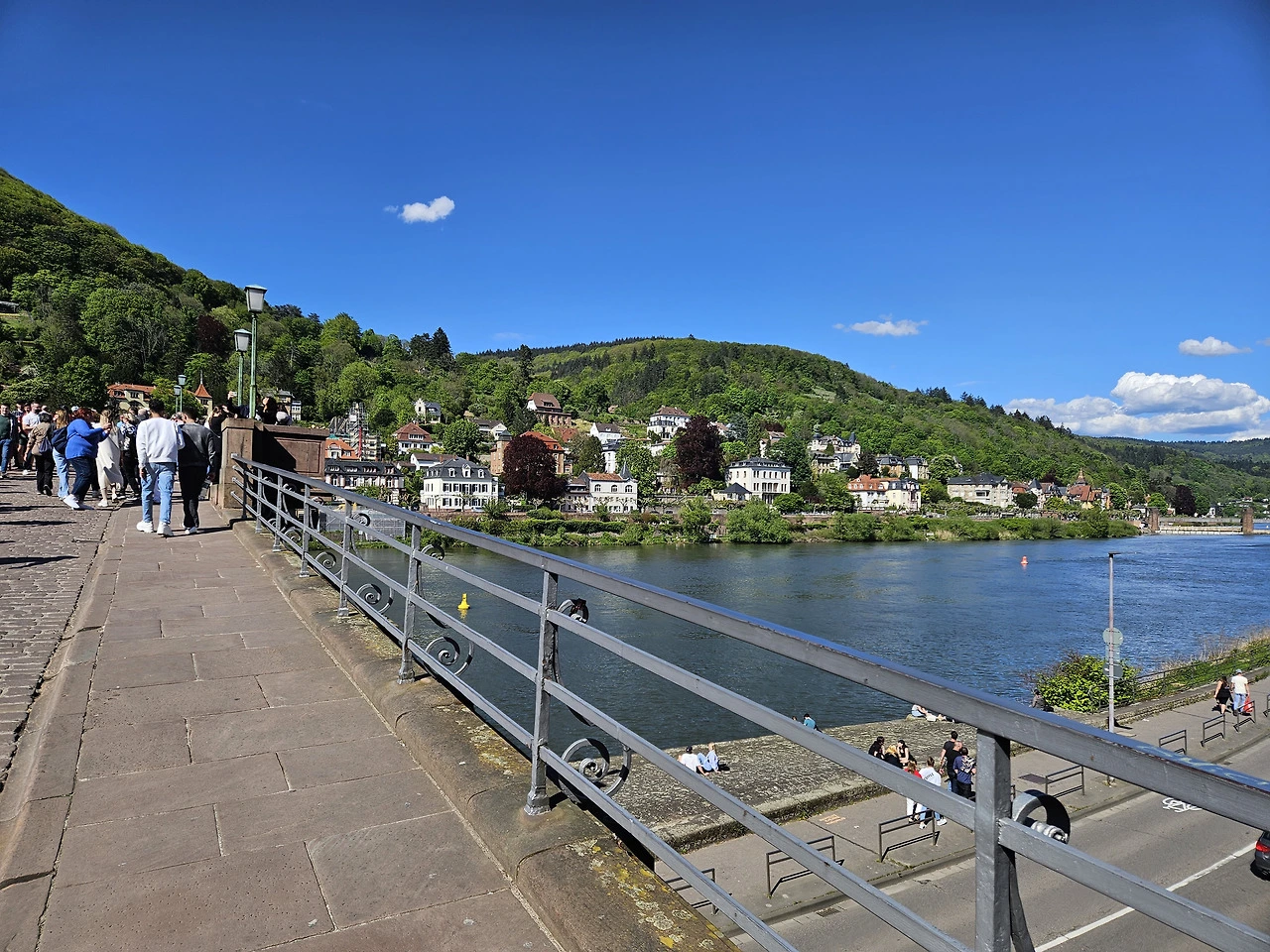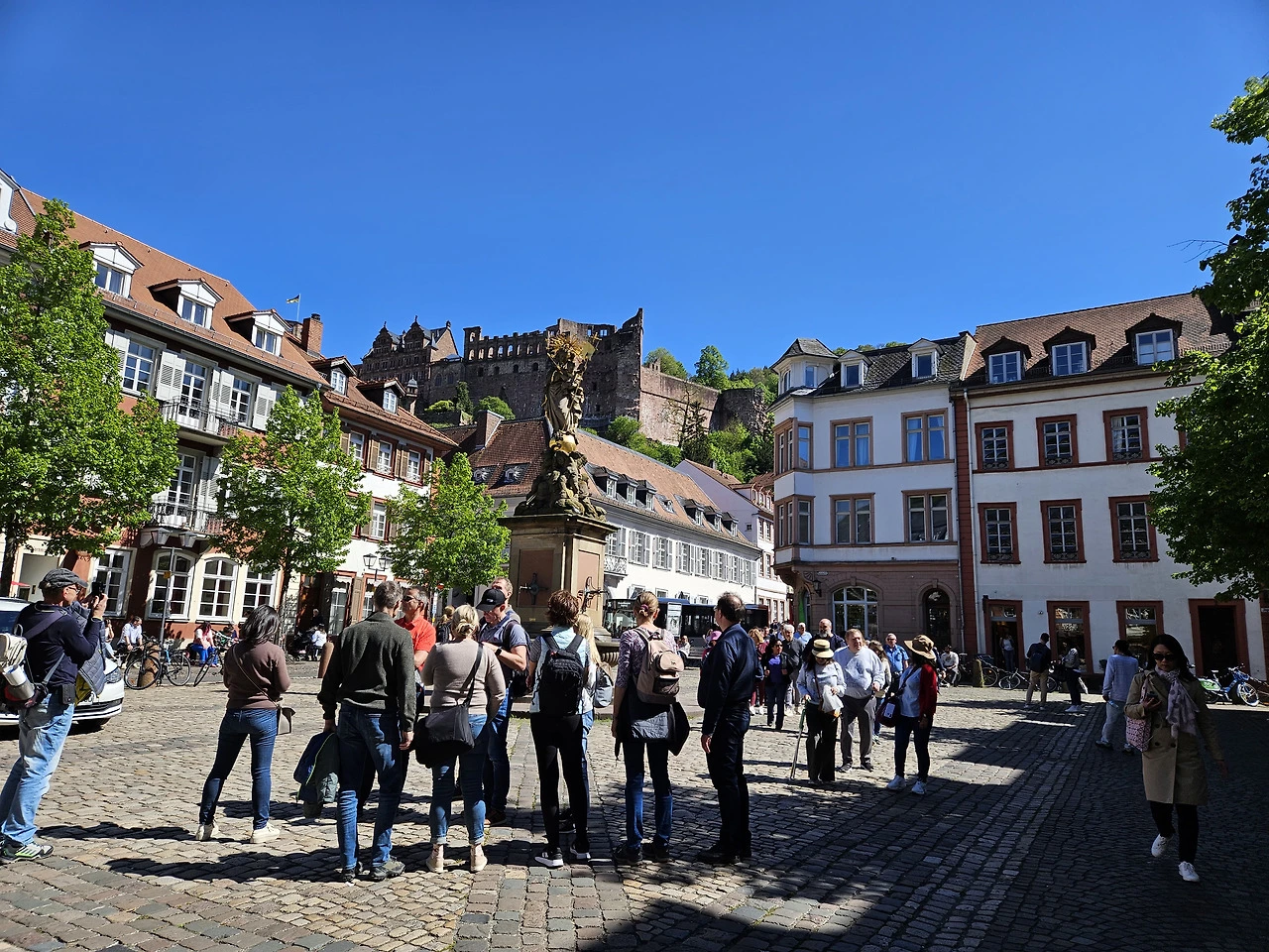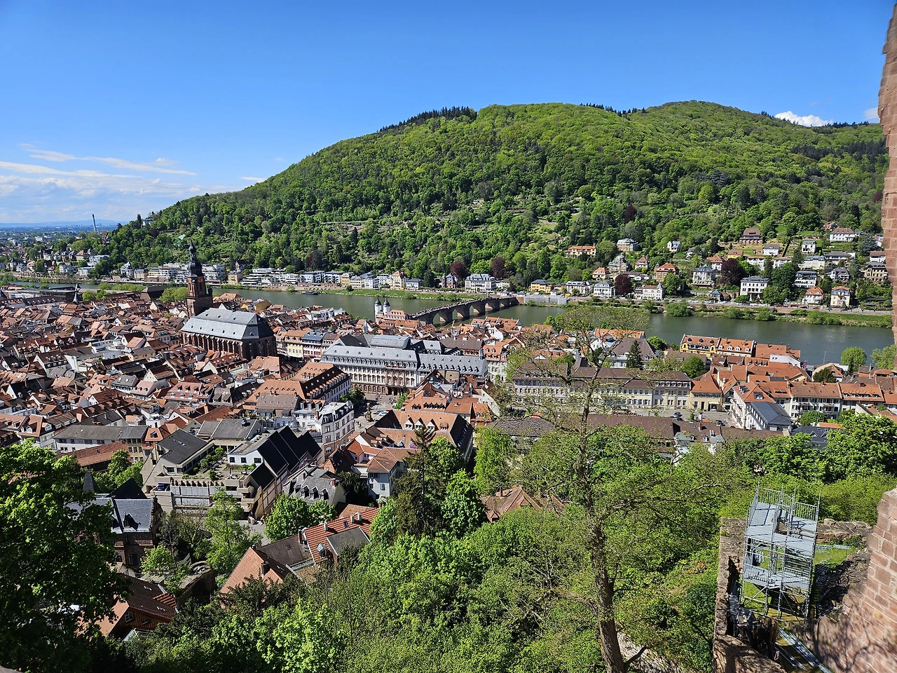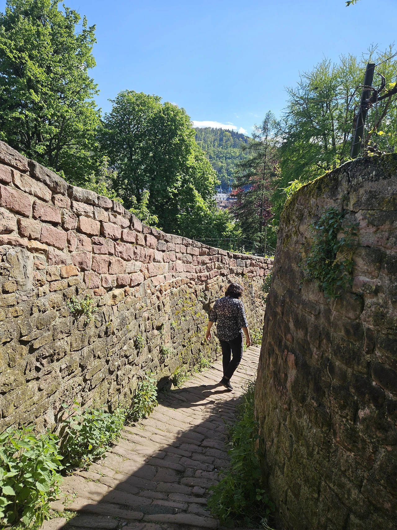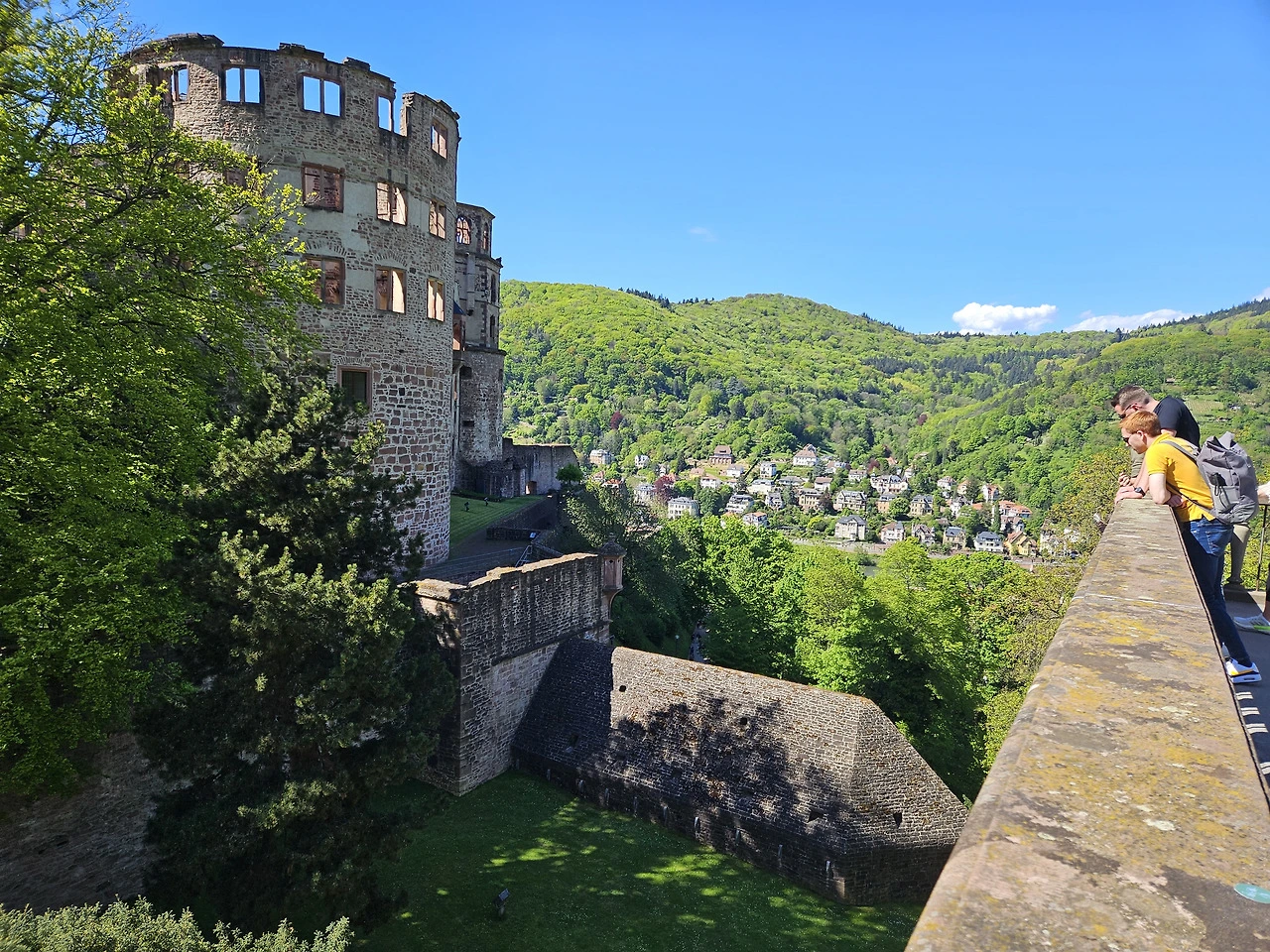 숙소가 있는 Waldbrunn이라는 작은 시골 마을에서 하이델베르크 성까지는 50분 거리이다. 하이델베르크로 가는 길은 강 따라 양쪽 기슭으로 집들이 죽 늘어서 있어 아름답다. 강에는 유람선도 있고 화물을 실은 기다란 배도 떠 있다. 하이델베르크에 도착해 P12이라는 주차장에 주차했다. 토요일이라 주차장이 만차로 언덕길에 골목에서 기다리고 있다가 한 대 나오면 한 대 들어갈 수 있다. 그런데 생각보다는 바로 들어갈 수 있었다. 주차장이 언덕 위에 있어서 아래로 내려오면 그 건물의 1층이 바로 푸니쿨라 탑승장이다.
