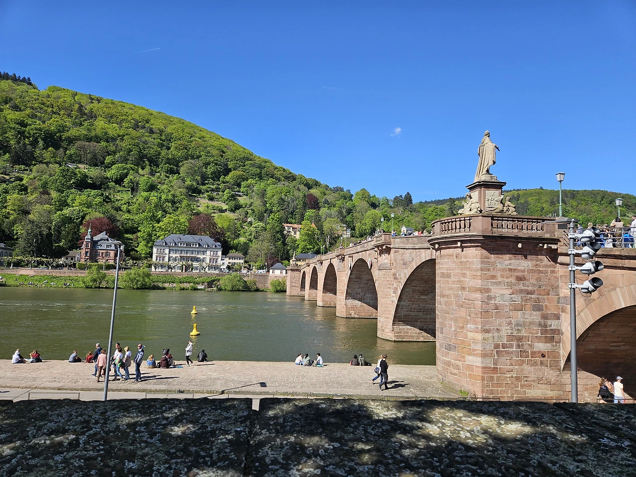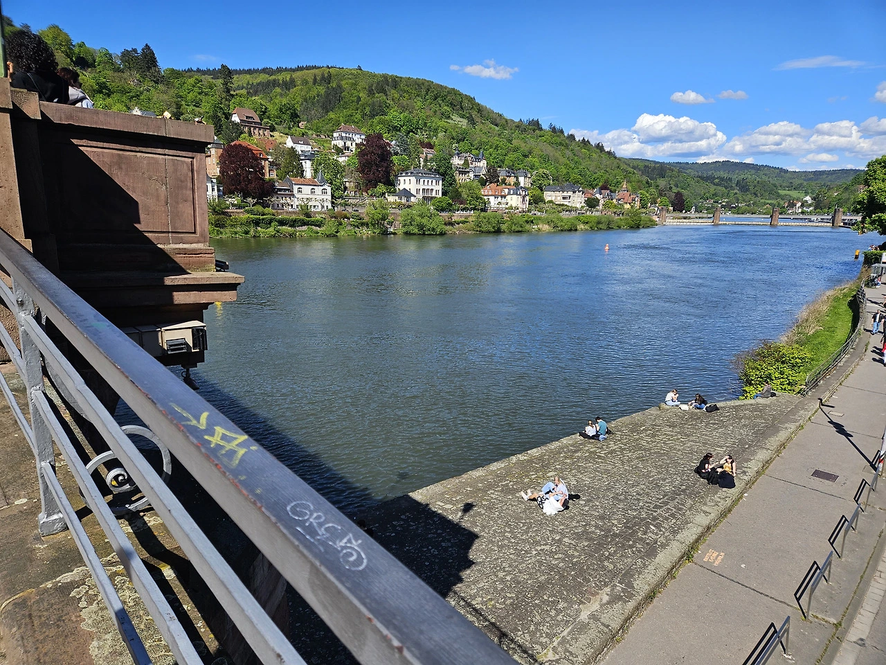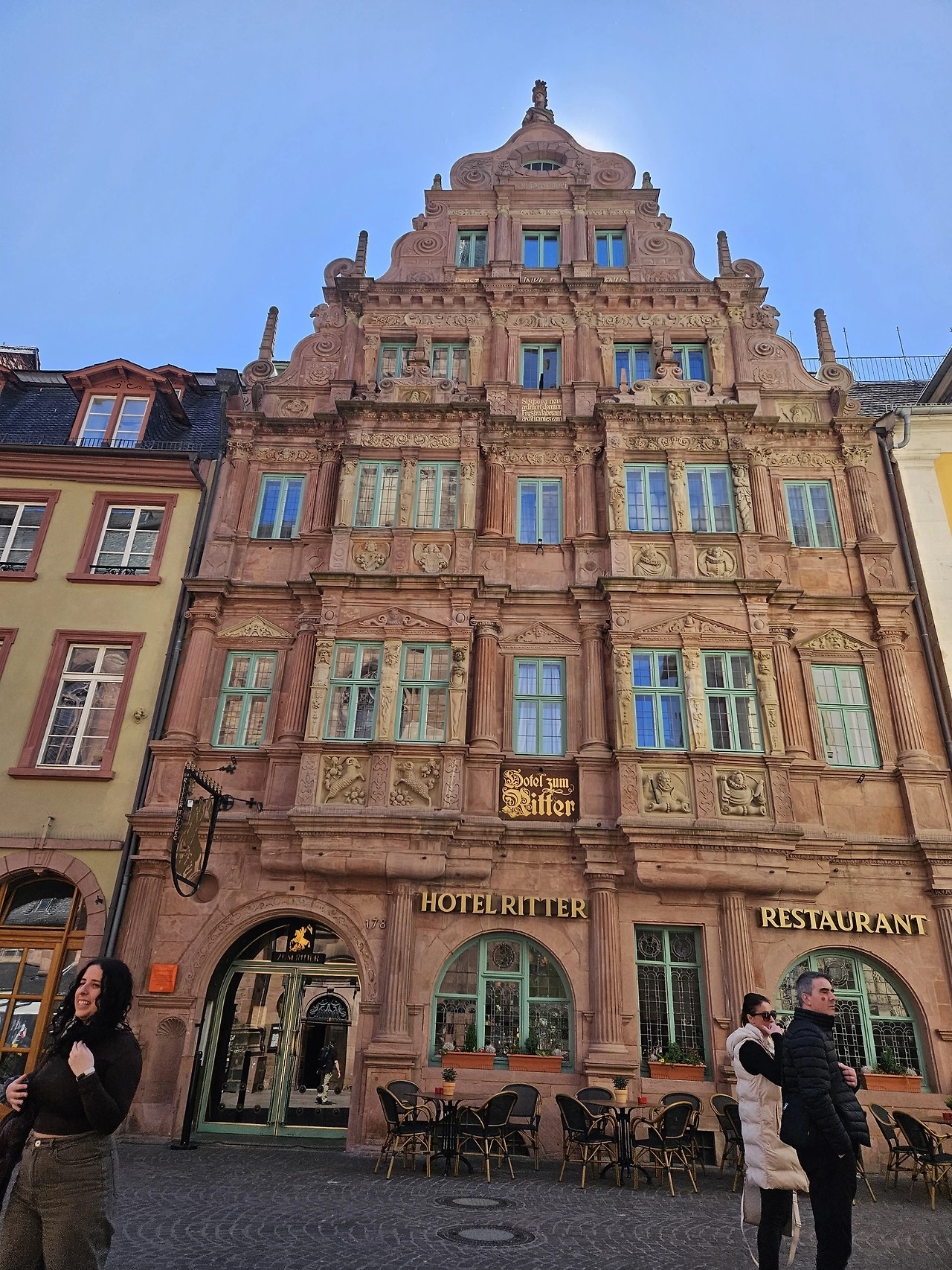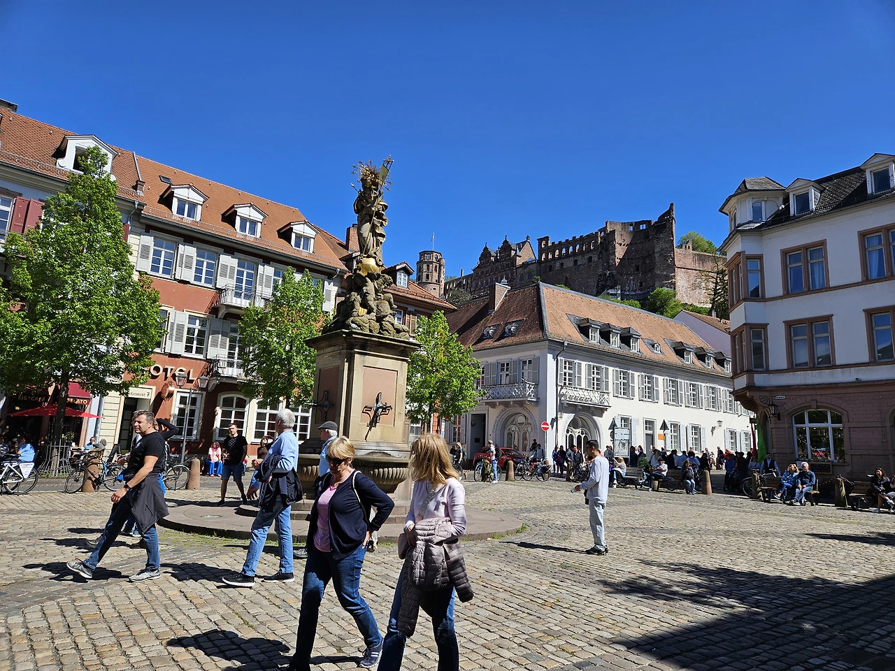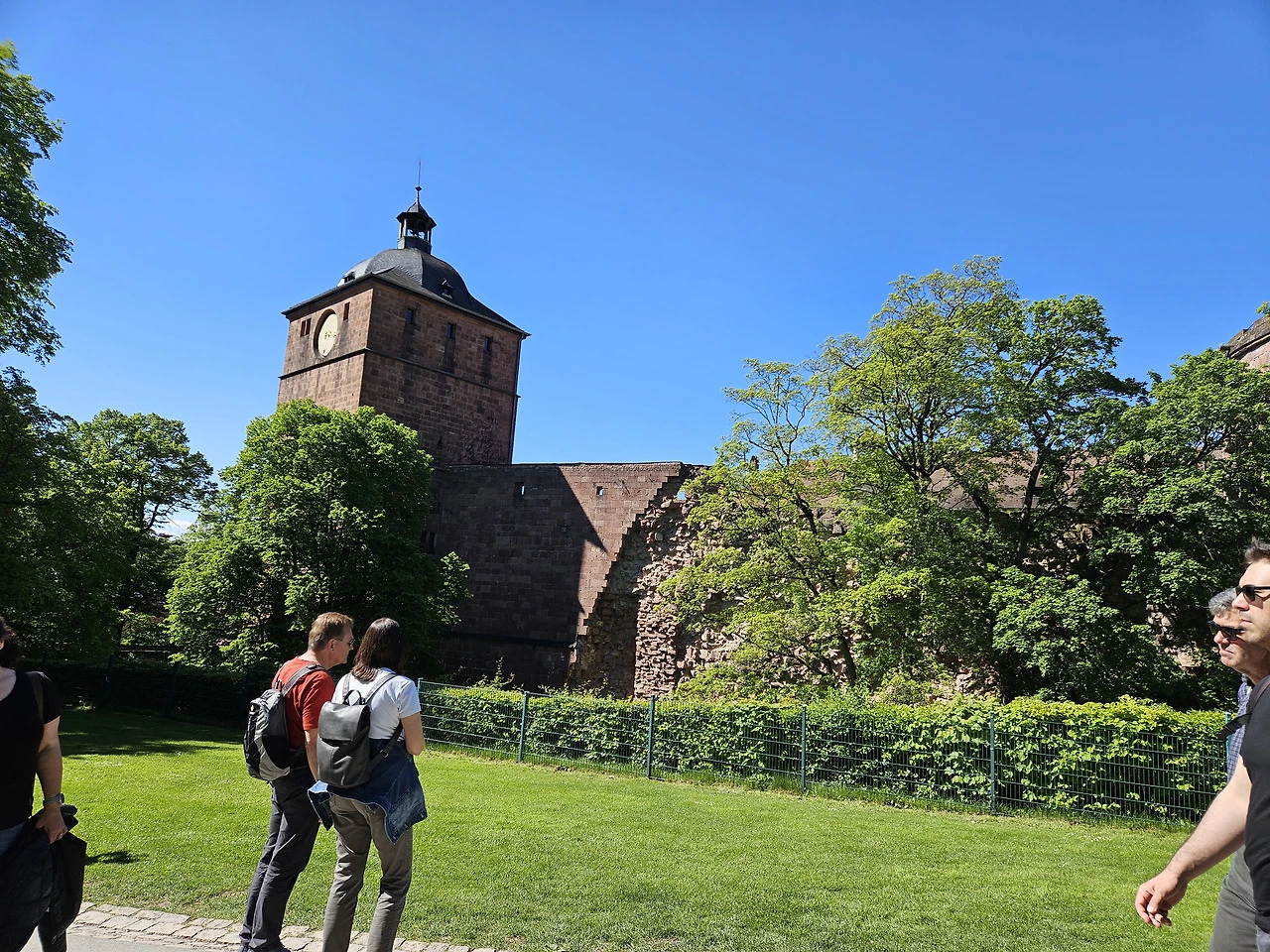 숙소가 있는 Waldbrunn이라는 작은 시골 마을에서 하이델베르크 성까지는 50분 거리이다. 하이델베르크로 가는 길은 강 따라 양쪽 기슭으로 집들이 죽 늘어서 있어 아름답다. 강에는 유람선도 있고 화물을 실은 기다란 배도 떠 있다. 하이델베르크에 도착해 P12이라는 주차장에 주차했다. 토요일이라 주차장이 만차로 언덕길에 골목에서 기다리고 있다가 한 대 나오면 한 대 들어갈 수 있다. 그런데 생각보다는 바로 들어갈 수 있었다. 주차장이 언덕 위에 있어서 아래로 내려오면 그 건물의 1층이 바로 푸니쿨라 탑승장이다.