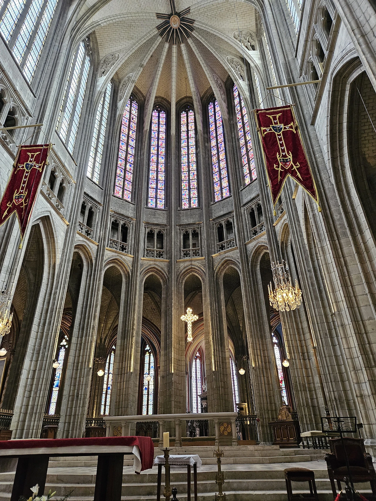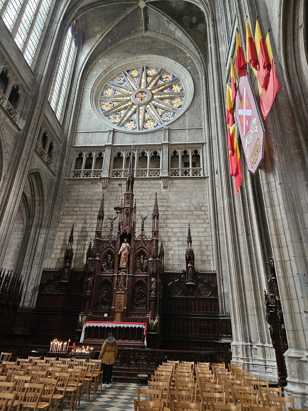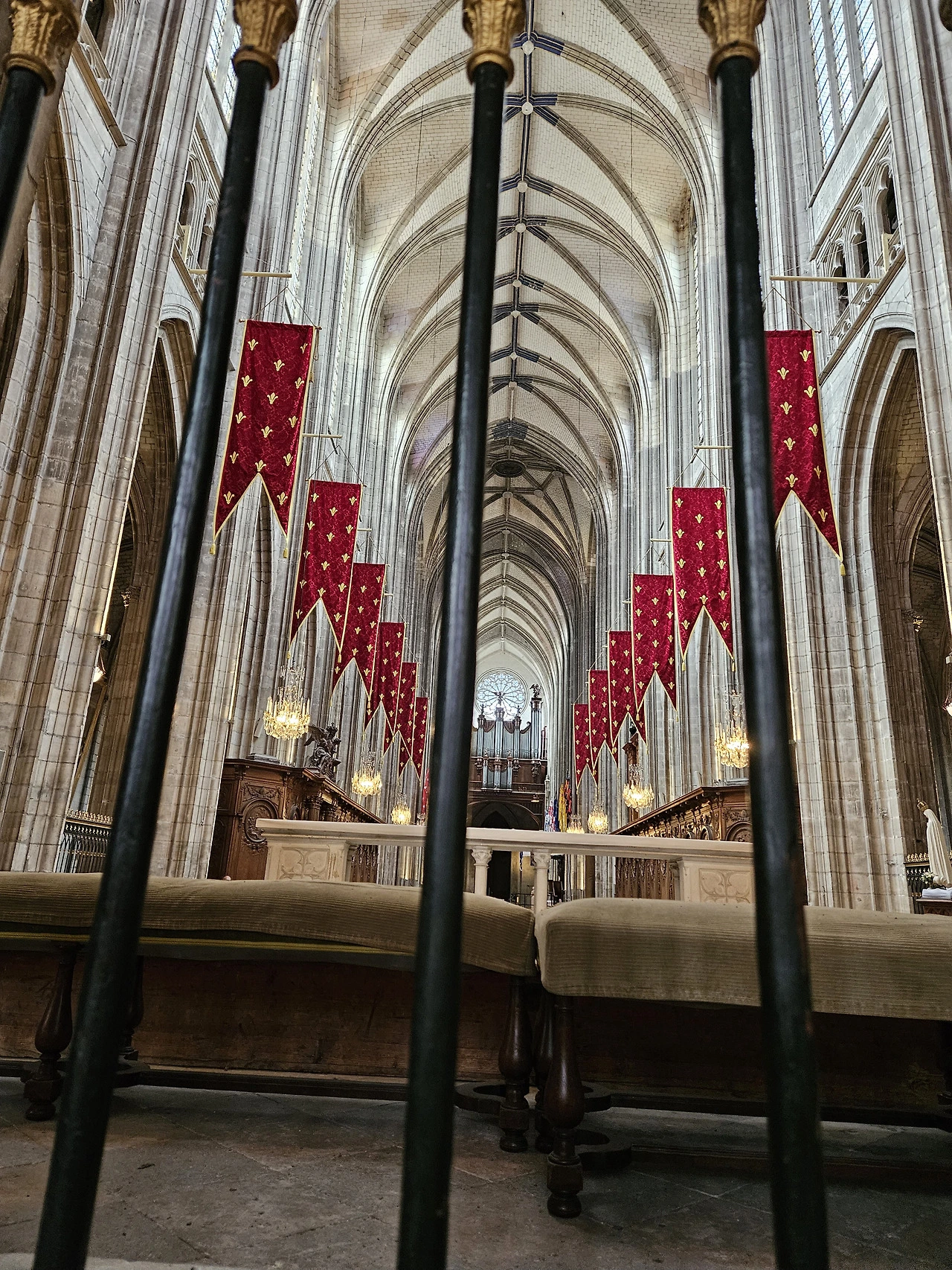 별 기대 없이 대성당 쪽으로 방향을 틀었는데 멀리 보이는 오를레앙 대성당이 규모가 대단히 크고 화려하다. 가까이 갈수록 압도당하는 기분이다. 내부도 깃발들이 화려하게 장식되어 있어 더욱 화려하고 웅장해 보인다.
