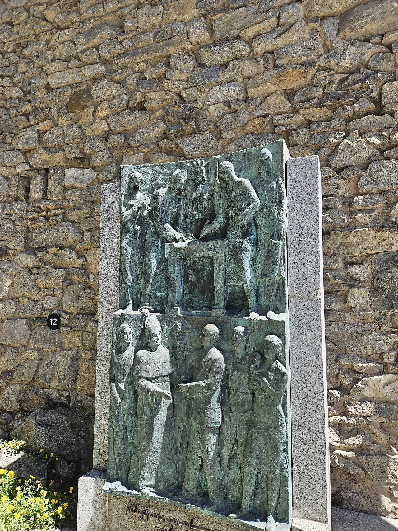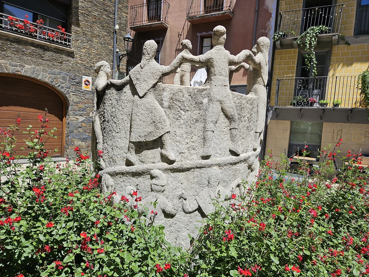 작은 광장에 있는 조각인데 무척 오래되어 보인다. 강강수월래하는 신라 토우 느낌. 두 층으로 돌아 올라가는 것도 재밌다.