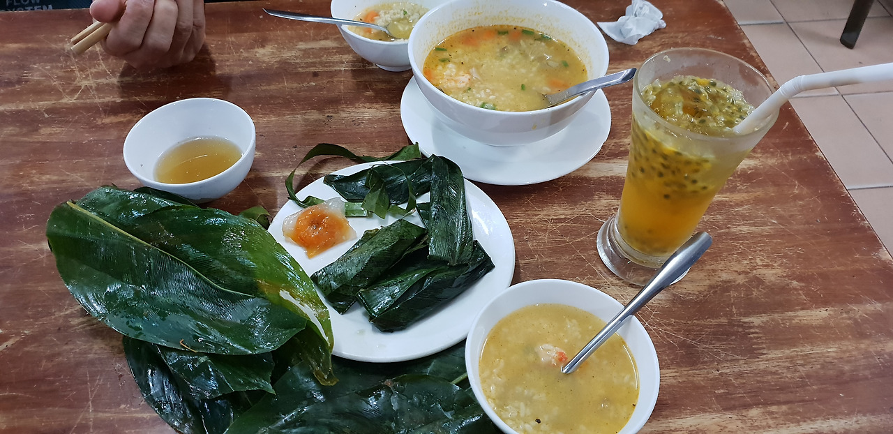 바나나 잎에 타피오카 전분과 새우를 넣고 찐 반록을 한 접시 시키고, 새우와 버섯을 넣은 죽을 시켰다. 음료는 패션프루트 주스. 이렇게 세 가지에 6천 원 정도다. 여기 주스는 다 생과일주스인데 1300원이다. 원 없이 먹고 가야지.