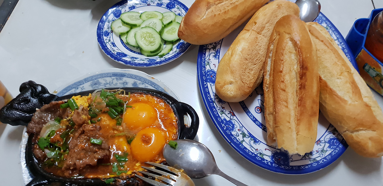 쇠고기 스테이크라고 해야 할까? 스테이크 철판에 쇠고기 양념구이와 계란 두 개, 소스를 얹었다. 철판에 지글지글 뜨겁게 나오는 게 맘에 든다. 바게트가 함께 나온다. 베트남은 바게트가 맛있다.