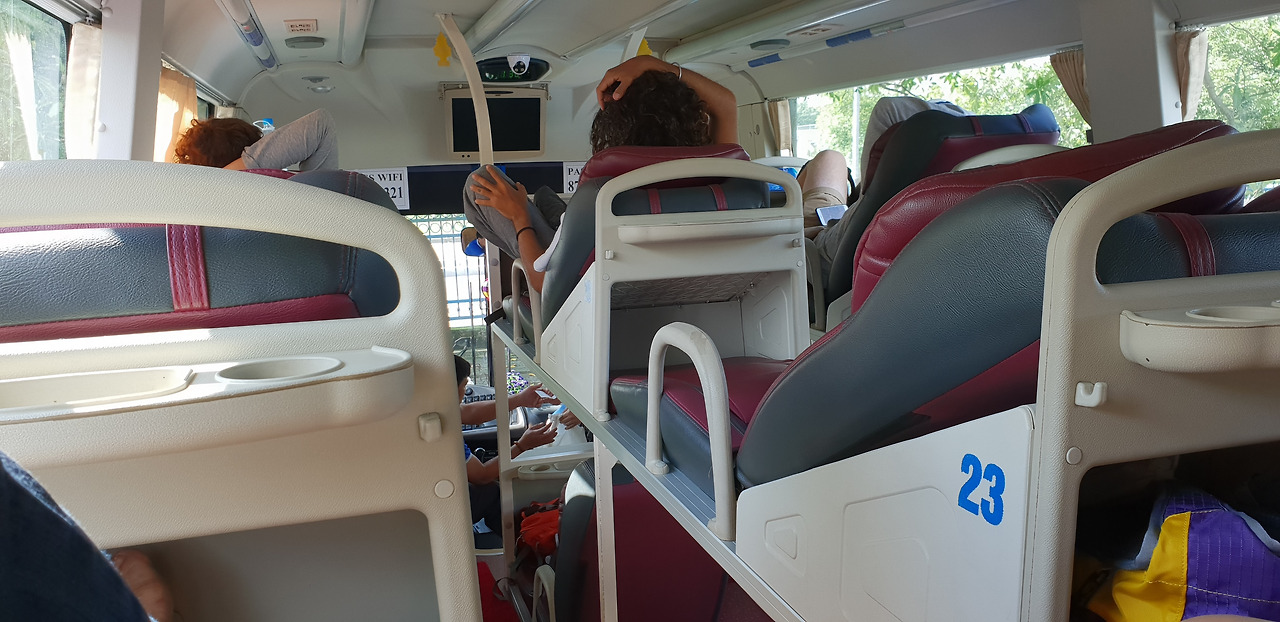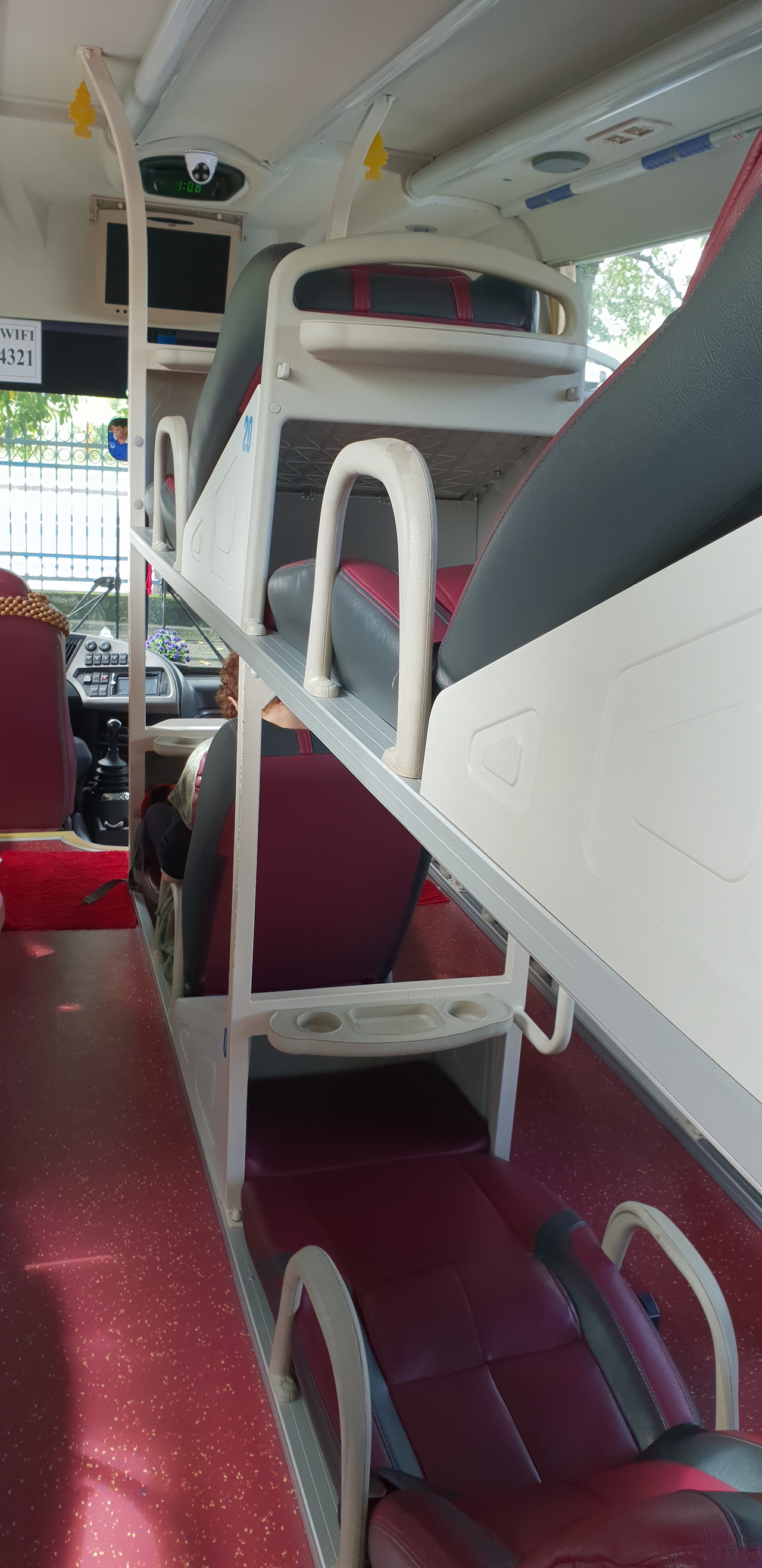 신투어에서 바우처를 버스표로 바꾸고 잠시 기다리니 봉고차가 와서 태우고 버스 있는 곳에 내려준다. 버스 탈 때 신발을 벗고 기사가 건네주는 비닐봉지에 신발을 넣어 들고 타야 한다. 슬리핑 버스는 처음 타본다. 버스를 타고 보니 위층 자리에 앉길 잘한 것 같다. 아래 좌석은 바닥에 붙어 있다. 좌석은 누울 수 있게 젖혀지고 발은 앞좌석 밑으로 뻗게 되어 있다. 버스 안은 꽤 청결하게 관리가 잘 되어 있다. 한 서양 청년이 아무 자리에나 앉았는지, 기사가 버스표를 보자하더니 딴 자리로 보내고는 그가 앉았던 자리를 신경질적으로 막 닦는다.