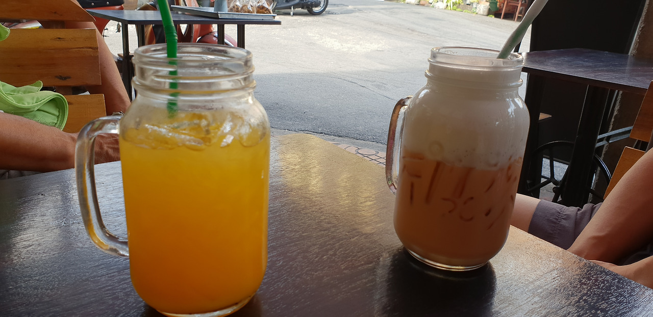 오렌지쥬스와 밀크티.어마어마한 양을 담아 준다. 가격은 35바트-1200원 정도.