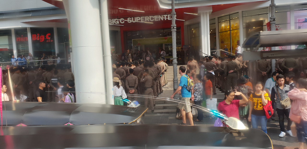 군인인지 경찰인지 쇼핑몰 문 앞에 줄지어 서 있었는데, 무슨 영문인지 모르겠다. 분위기가 심각하진 않은 걸로 봐서 시위 같은 것 때문은 아닌 것 같다. 버스를 타고 가던 중에 본 광경이라 자초지종은 알 수가 없다.
