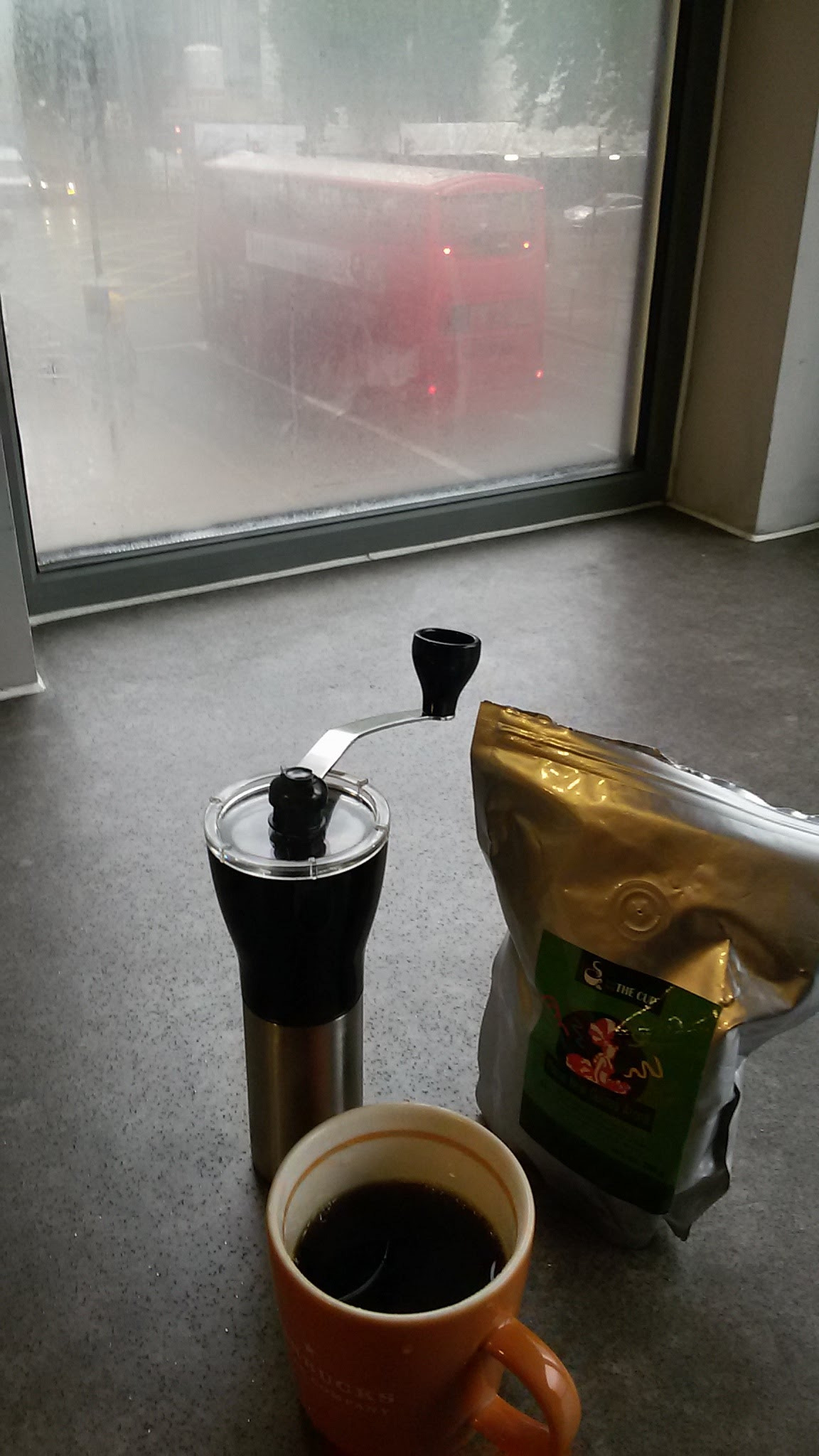 여행중 나만의 조그만 사치. 원두를 즉석에서 갈아 핸드드립커피로 하루를 시작하는 것. 방 창문앞에 넓은 공간이 있어 운치가 있다.