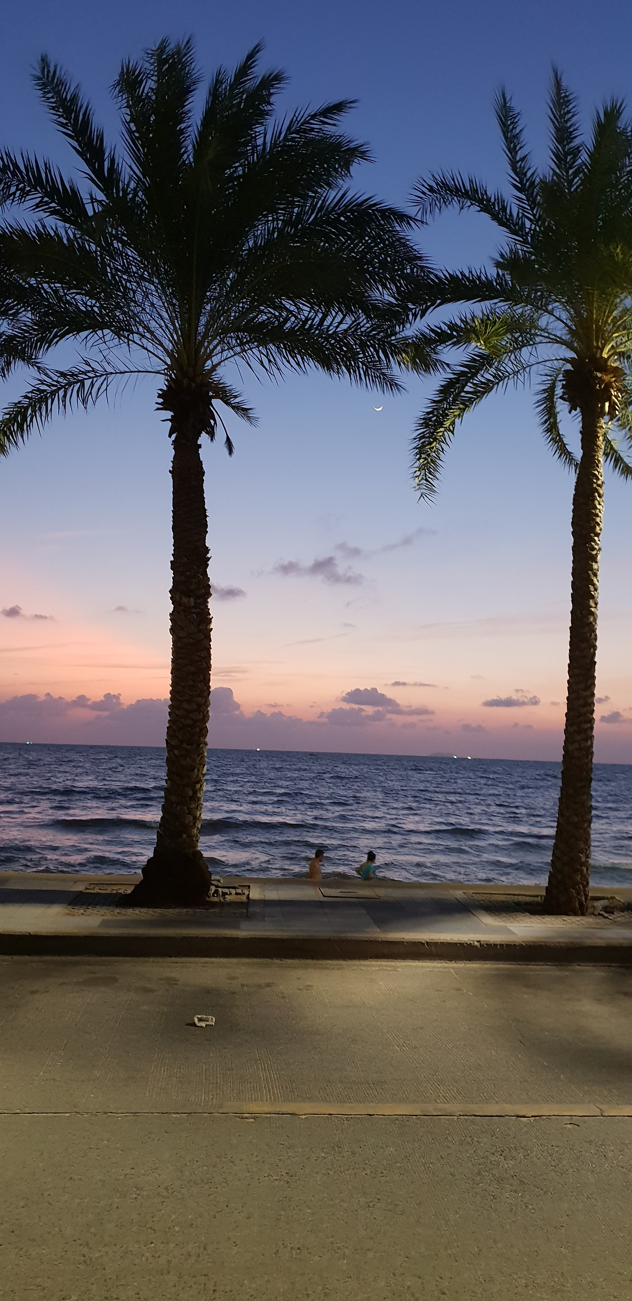 방 창문에서 건물 사이로 보이는 바다.