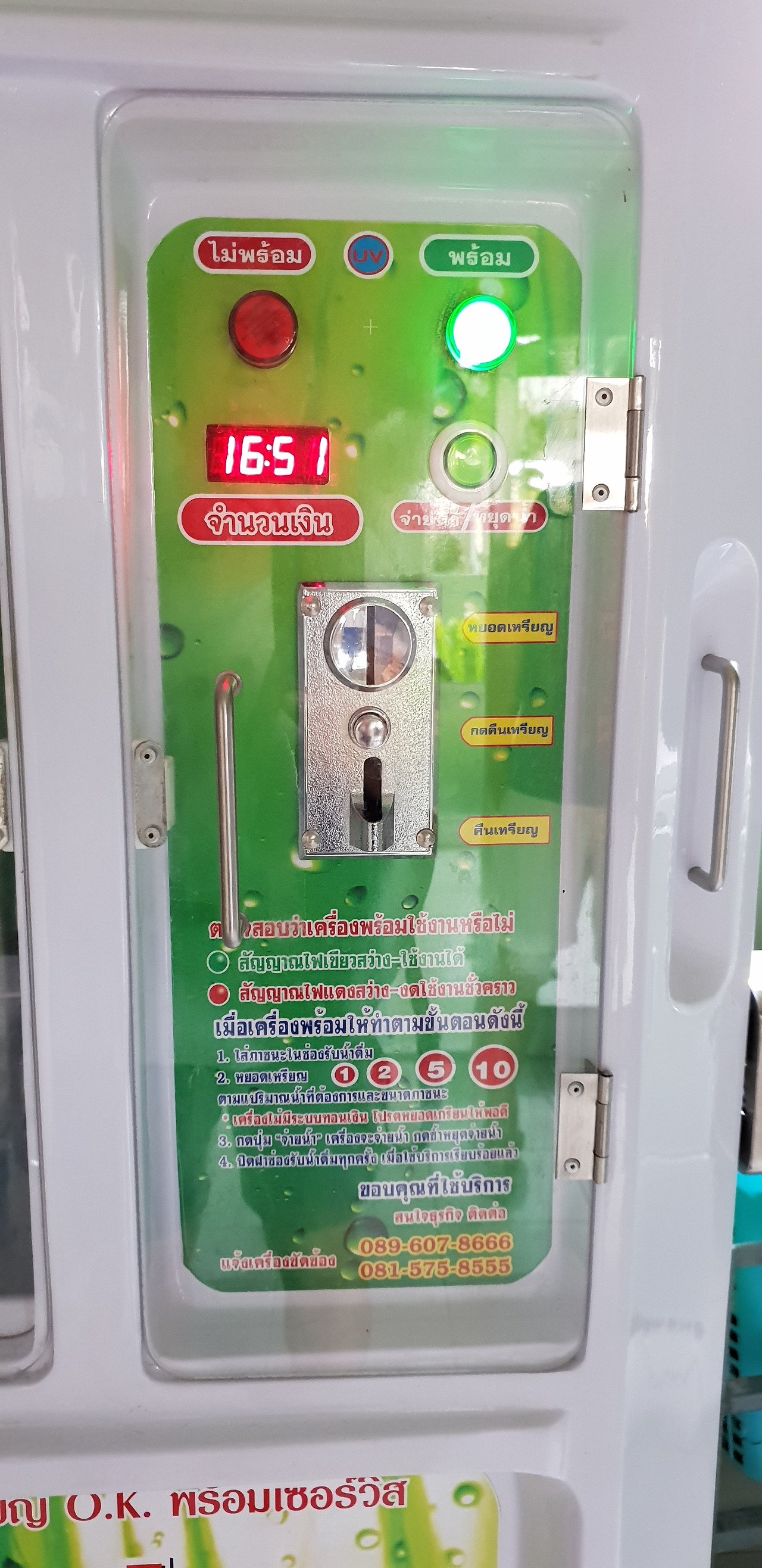 동전을 넣으면 숫자 있는 부분에 금액이 뜬다. 초록색 버튼을 누르면 물이 나오고 한번 더 누르면 멈춘다. 거스름돈이 나오는지는 잘 모르겠다.