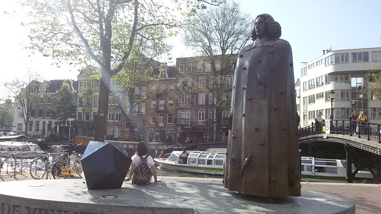 스피노자 동상.망토입은 특이한 모습이 인상적이다.