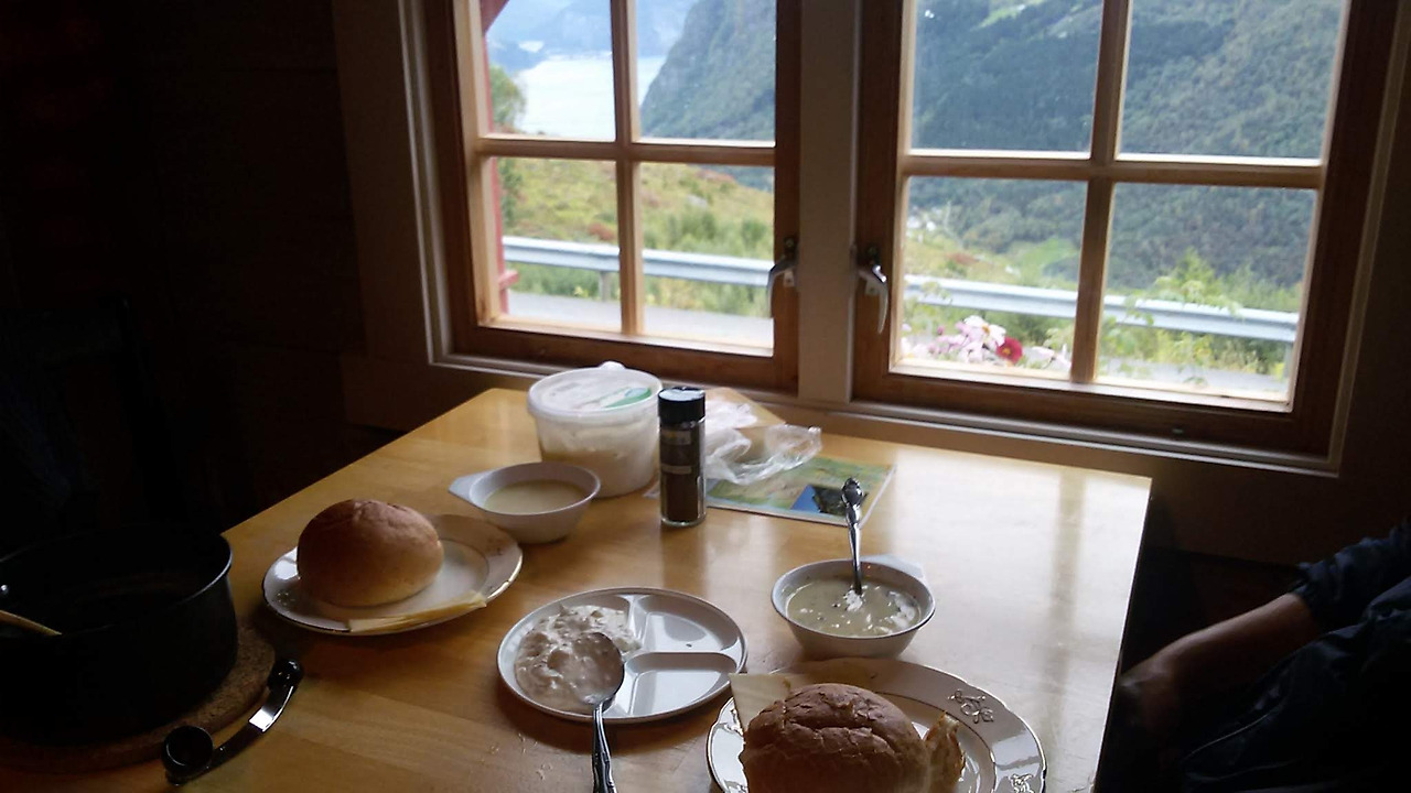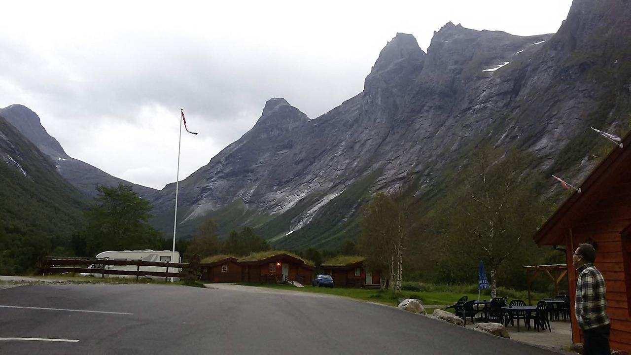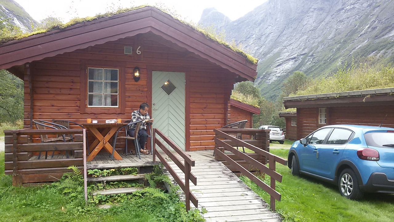 트롤스티겐캠핑이라는 캠핑장인데 경치가 그만이다. 앞에는 소가 왔다갔다 한다. 오두막도 노르웨이식으로 지붕에 풀이 나있어 운치있지만, 내부는 역시 낡고 불편하다.