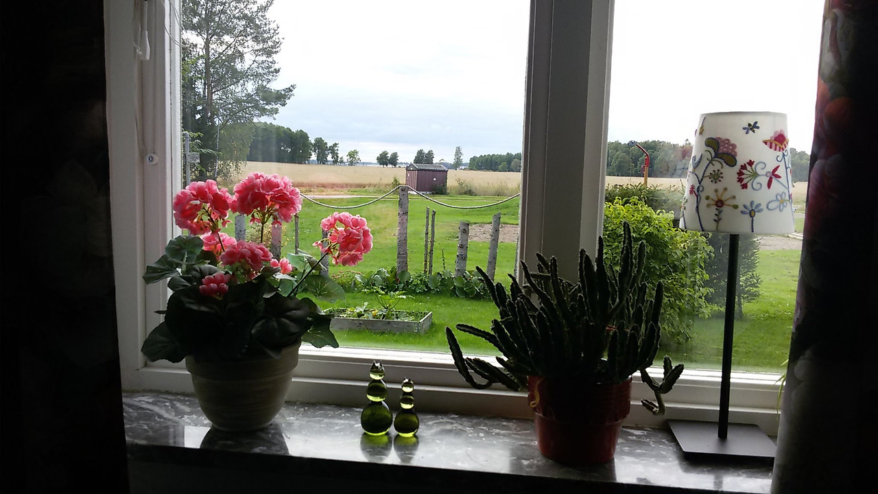 침실창밖 목가적인 풍경. 세심하게 꽃장식까지.