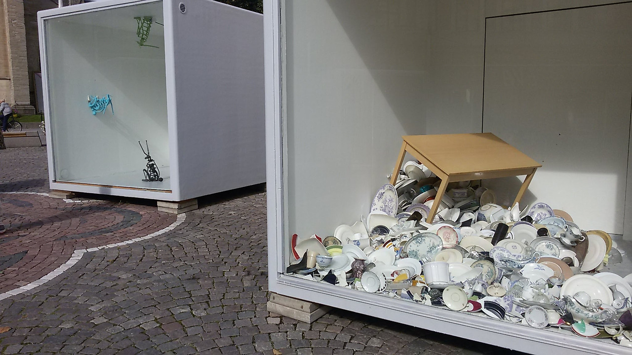깨진 그릇들을 쌓아놓은 설치미술. 빈 박스만 하나 놓인 곳도 있는데 박스가 꿈틀꿈틀 움직인다.