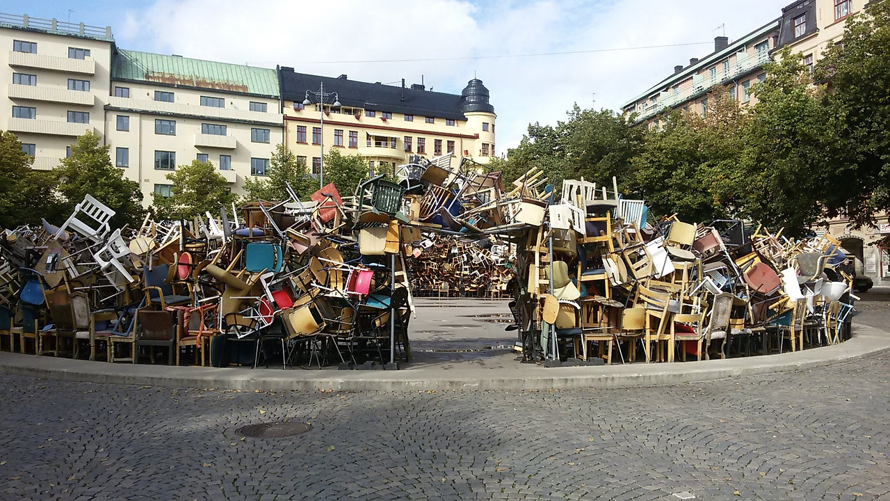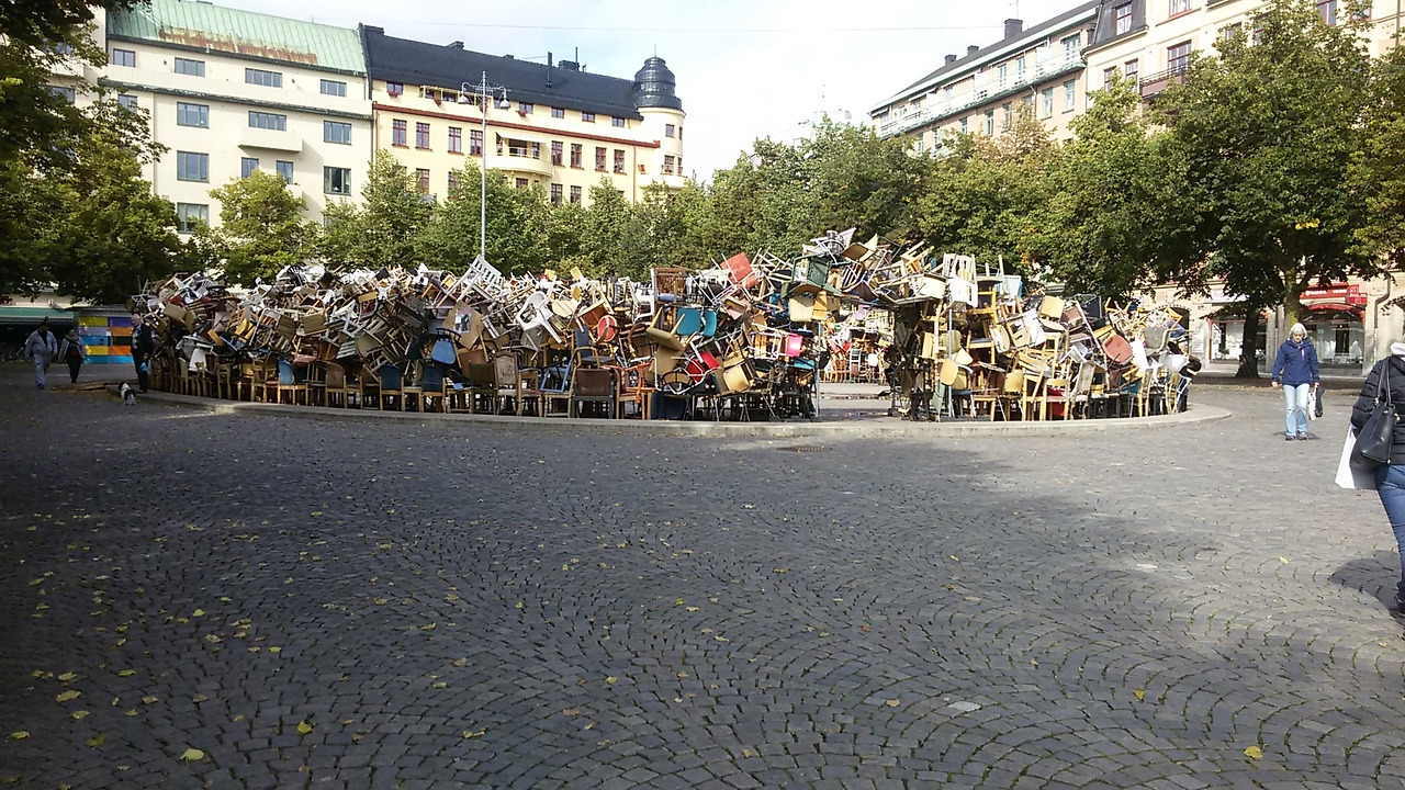 조그만 광장에 설치미술로 낡은 의자를 동그랗게 쌓아 놓았다. 무슨 의미인지 알면 더 좋을 것 같은데 설명은 없다.