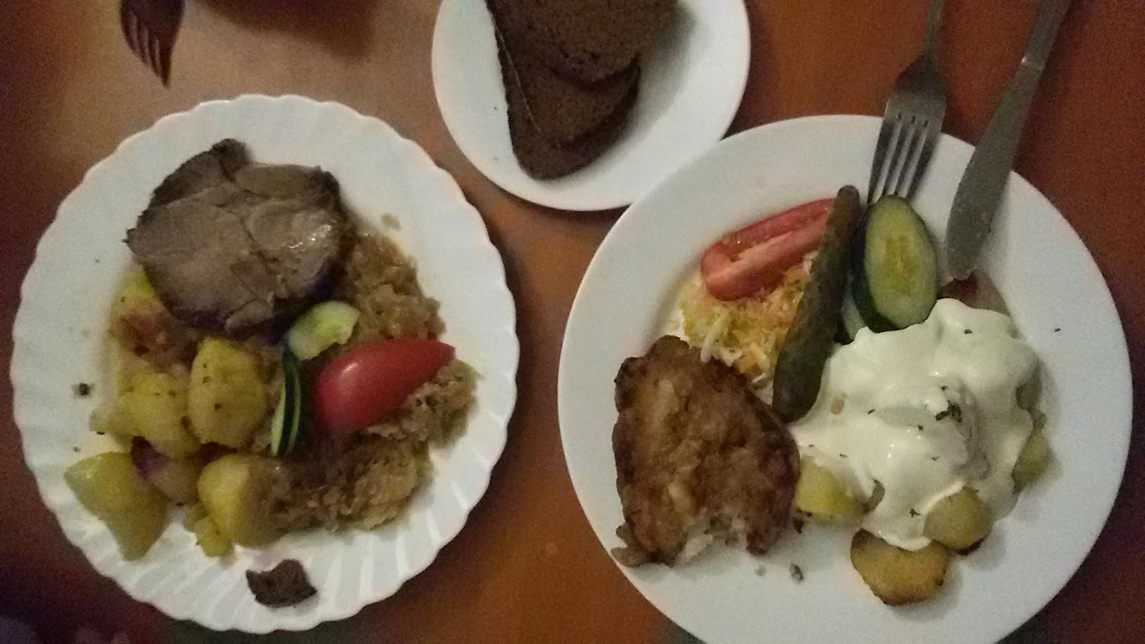느지막히 큰 길 건너 24시간 식당에 저녁을 먹으러 갔는데 영어메뉴가 없다. 주인아줌마가 닭, 생선, 돼지고기 중에 고르라고하고, 감자가 곁들여 나온다고하기에 나는 생선, 남편은 돼지고기를 시켰다. 1인분에 4€ 인데 썩 맛있진 않아도 먹을만 했다. 현지인들만 오는 밥집느낌이라 좋았다.