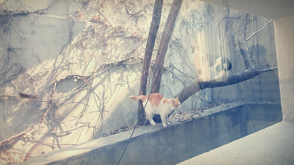 이 녀석들은 길에서 마주치는 것뿐만 아니라, 무단 가택침입을 해서 어색한 모양새로 만나곤 한다. 허락해준적도 없는데 마치 자기 자리인듯, 마당에 주저앉아 졸다 가는 일은 예삿일이다. 한 번은 옆집 지붕을 훌쩍 타고 2층 베란다로 넘어오다가 의자에 앉아서 여유를 부리는 나와 눈이 딱 마주친 적이 있다. 사람과 눈이 마주친 게 놀라서 훌쩍 도망칠 법도 한데, 까맣고 하얀 고양이는 그대로 주저앉아 내 눈을 똑바로 바라보다가 그루밍하는 여유를 보여주기까지도 했다. 길거리 삶의 애환이 느껴지지 않는 이 도도함은 어디서 나오는 것인지.
