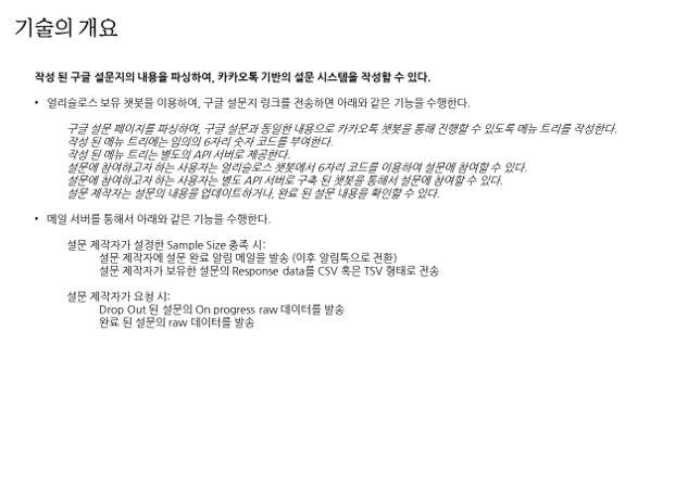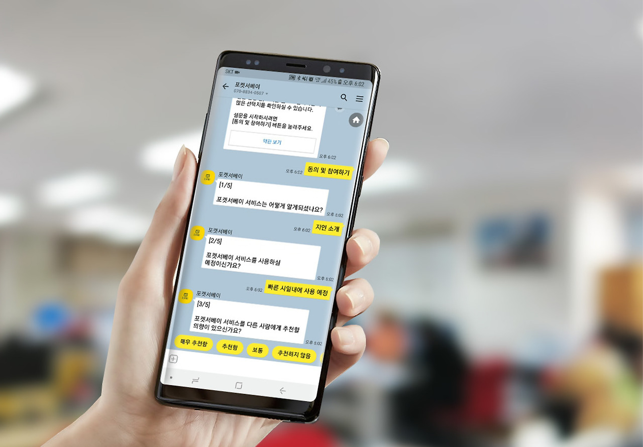 포켓서베이 소개 이미지. 서비스 소개글은 아니었으나 개발 방법론 설명에 필요할 것 같아서...포켓서베이 주요 기능 중 하나는 모바일 메신저 '카카오톡' 환경에서 바로 설문조사 참여가 가능하다는 것이다. 우리는 처음에 이 서비스를 준비하기 전에, '카카오톡 챗봇'을 이용한 설문 참여 환경의 사용성과 시장성에 대해서 빠르게 확인하고 싶었다.