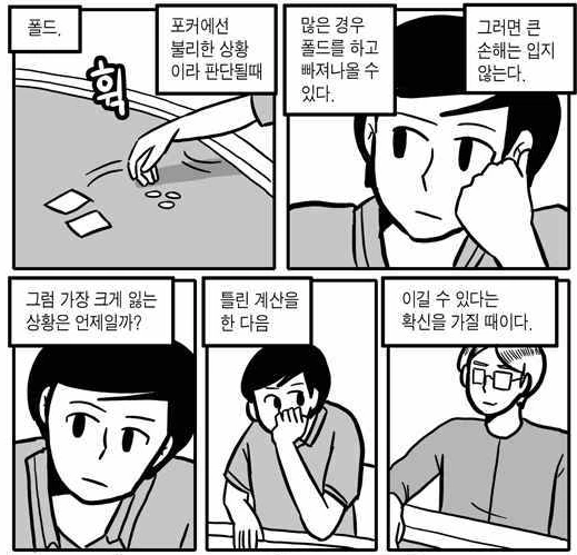 포커에선 불리한 상황이라 판단될 때, 많은 경우 폴드를 하고 빠져나올 수 있다. 그러면 큰 손해는 입지 않는다.