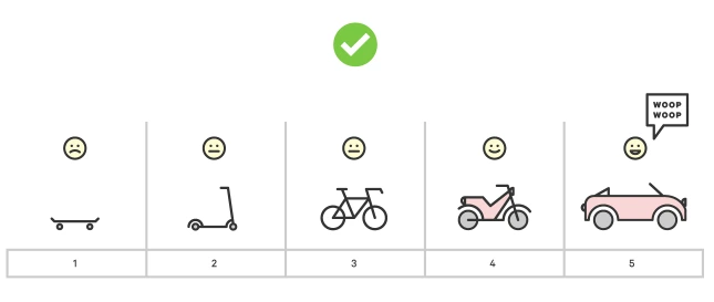 자동차를 만들기 위해서, 가장 먼저 스케이트 보드를 만들고, 그다음 킥보드를 만들고, 자전거를 만들고, 오토바이를 만들고, 자동차를 만든다. 많은 린스타트업 강의 자료를 보면 위와 같은 형태가 스타트업이 추구해야 할 개발 방법론이라고 이야기한다.
