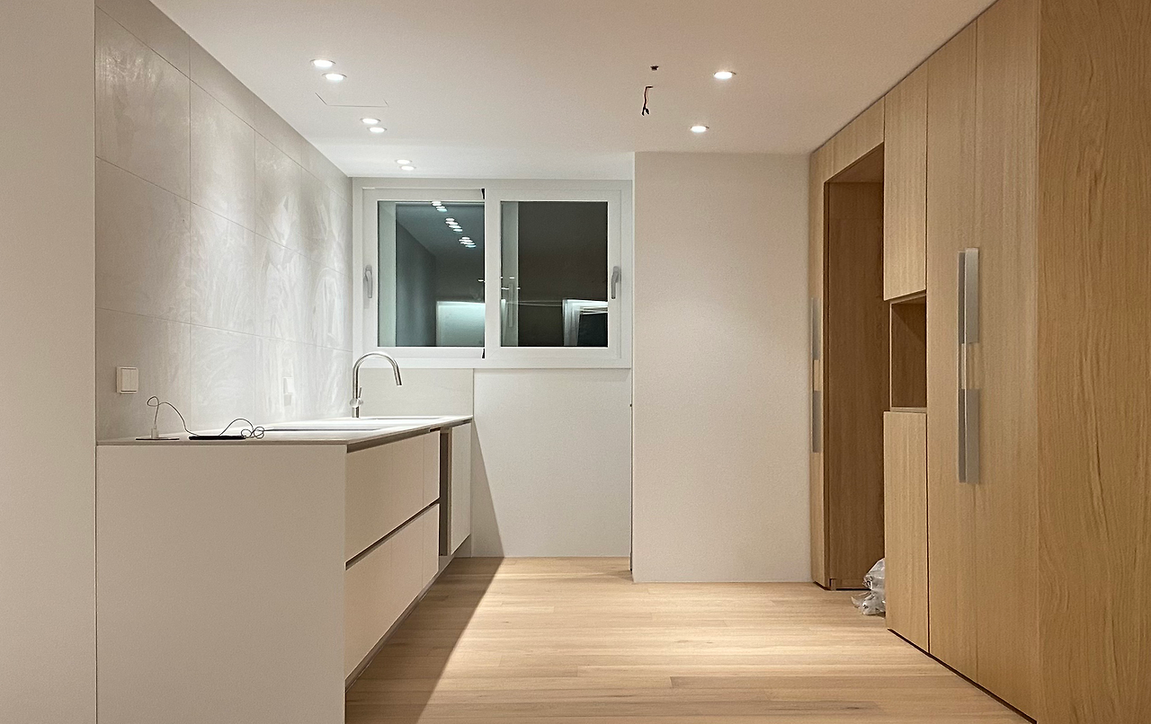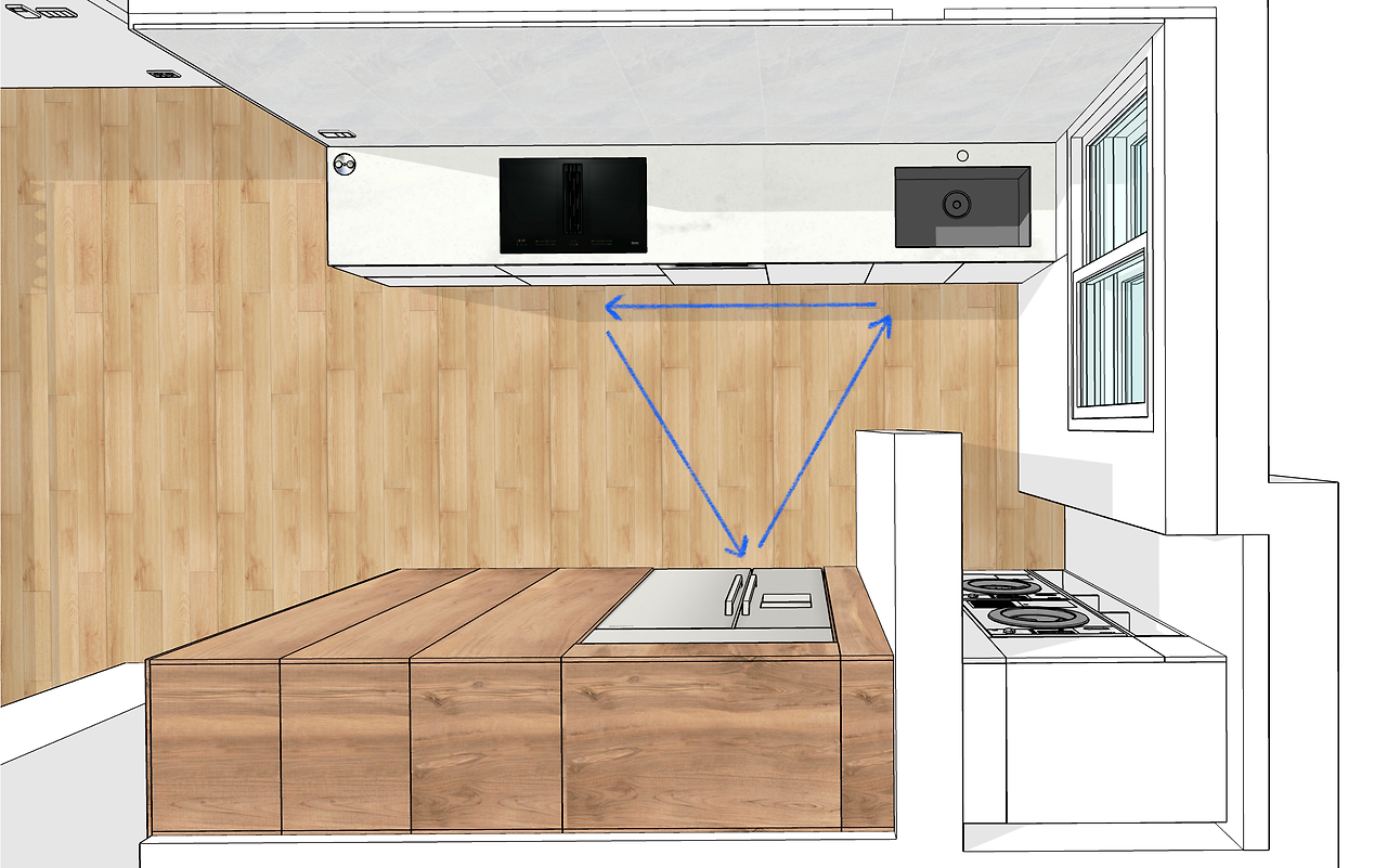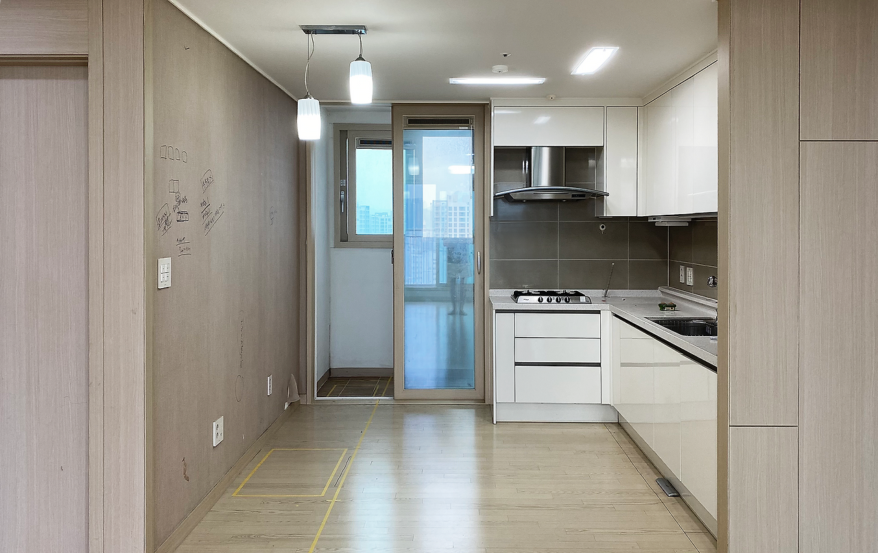 가장 많은 고민을 했던 곳은 주방이었습니다. 집에 있는 동안 집과 가장 많은 상호작용을 하며 목적에 따라 다양한 동선이 만들어지는 곳이기 때문입니다. 우리는 같이 동시에 요리를 할 수 있는 넓은 조리공간을 원했지만 기존 조리공간은 너무 좁았고, 작게나마 식탁 둘 곳을 남겨두다 보니 수납공간마저 적은 애매한 구조였습니다. 그래서 공간 활용을 용도에 맞게 극대화하기 위해서 과감하게 ‘요리' 목적인 주방과 ‘식사' 목적인 다이닝룸을 분리하기로 했습니다. 우선 주방은 발코니를 터서 확장했고, 조리공간을 주방에서 가장 긴 길이가 나오는 반대쪽 벽으로 이동했습니다. 그렇게 싱크대와 인덕션, 냉장고가 정삼각형을 이루는 조리에 최적화된 동선이 만들어졌고, 한쪽 벽은 전부 수납공간으로 사용하여 이전보다 수납력을 3배 이상 늘렸습니다.
