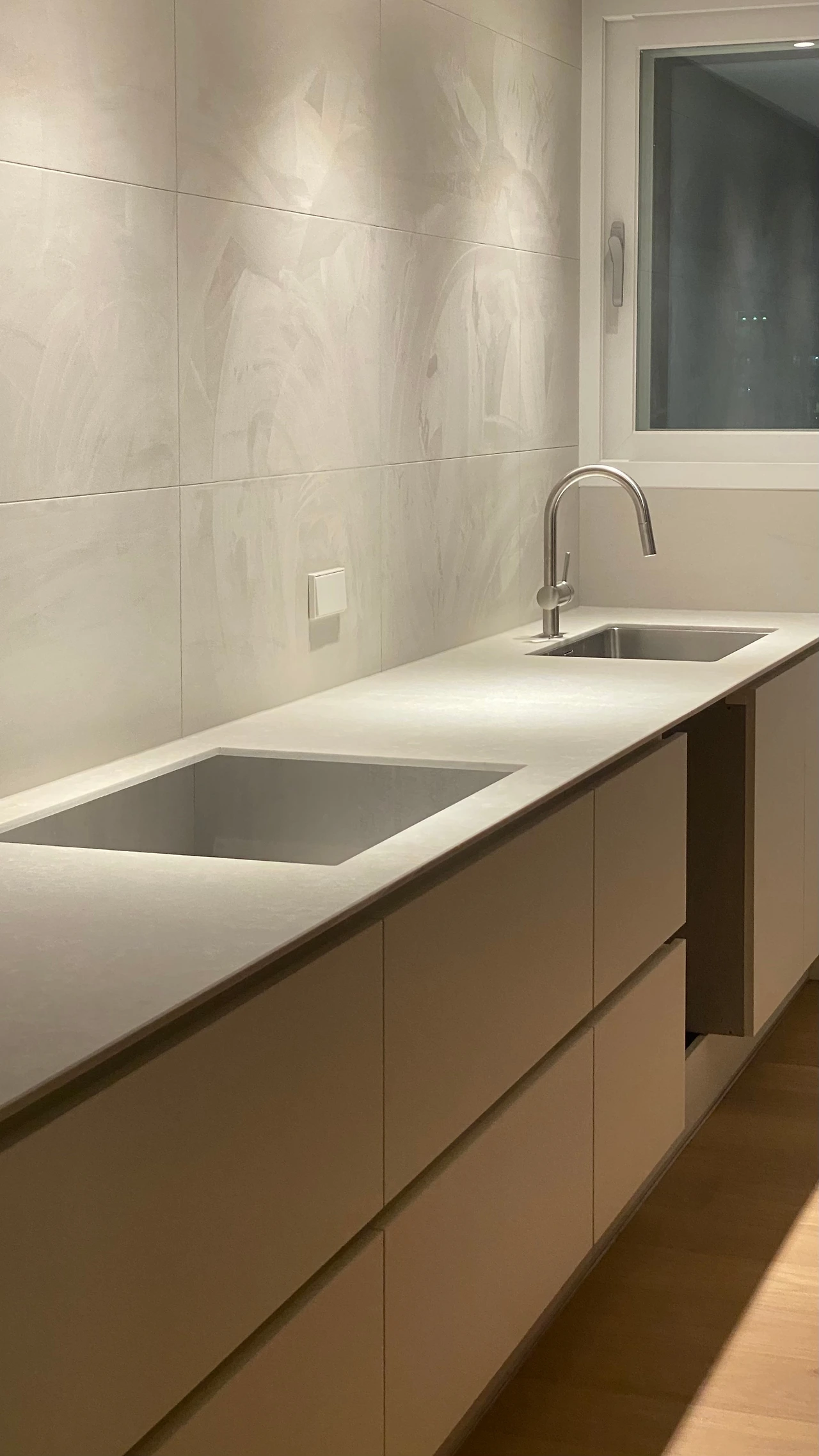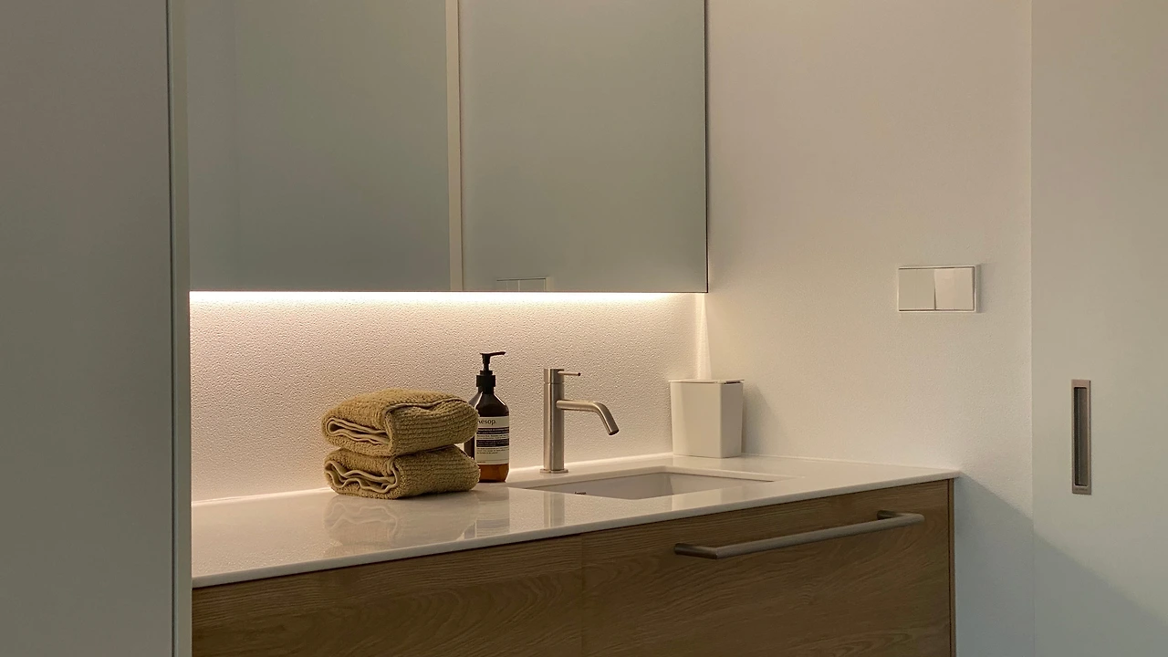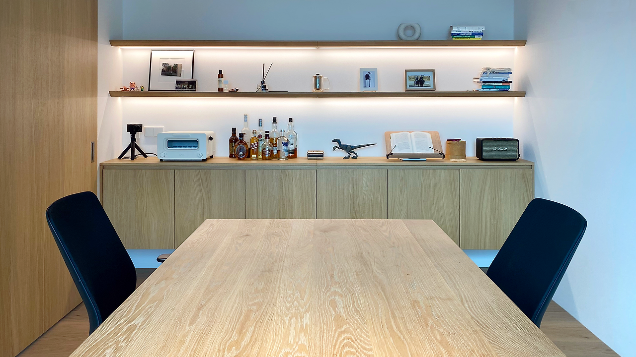 집은 앱과 다르게 3차원이라서 x, y 축에 해당하는 ‘동선’ 뿐 아니라 z 축(높이)이 존재합니다. 그래서 사용성을 위해 각자의 키에 맞는 높이도 고려해야 하는데요, 저희는 우선 집안의 모든 스위치 높이를 하나로 통일했습니다. 또 싱크대, 세면대, 작업대 등의 높이도 모두 통일하여 최적의 사용성과 일관성을 챙겼습니다. 아내와 저는 키가 다르기 때문에 둘 다 만족할 만한 높이를 찾기 위해 가구 쇼룸을 방문하여 다양한 높이의 싱크대를 체험해 봤고, 허리가 아프지 않을 적절한 중간 높이를 같이 찾아보았습니다. 이 외에도 선반, 옷걸이, 콘센트 등 매일 사용하는 기능들의 높이까지 우리에게 맞춰 설계하다 보니 우리 집이 더 편해지고, 곳곳에서 일관된 아름다움을 느낄 수 있게 되었습니다.