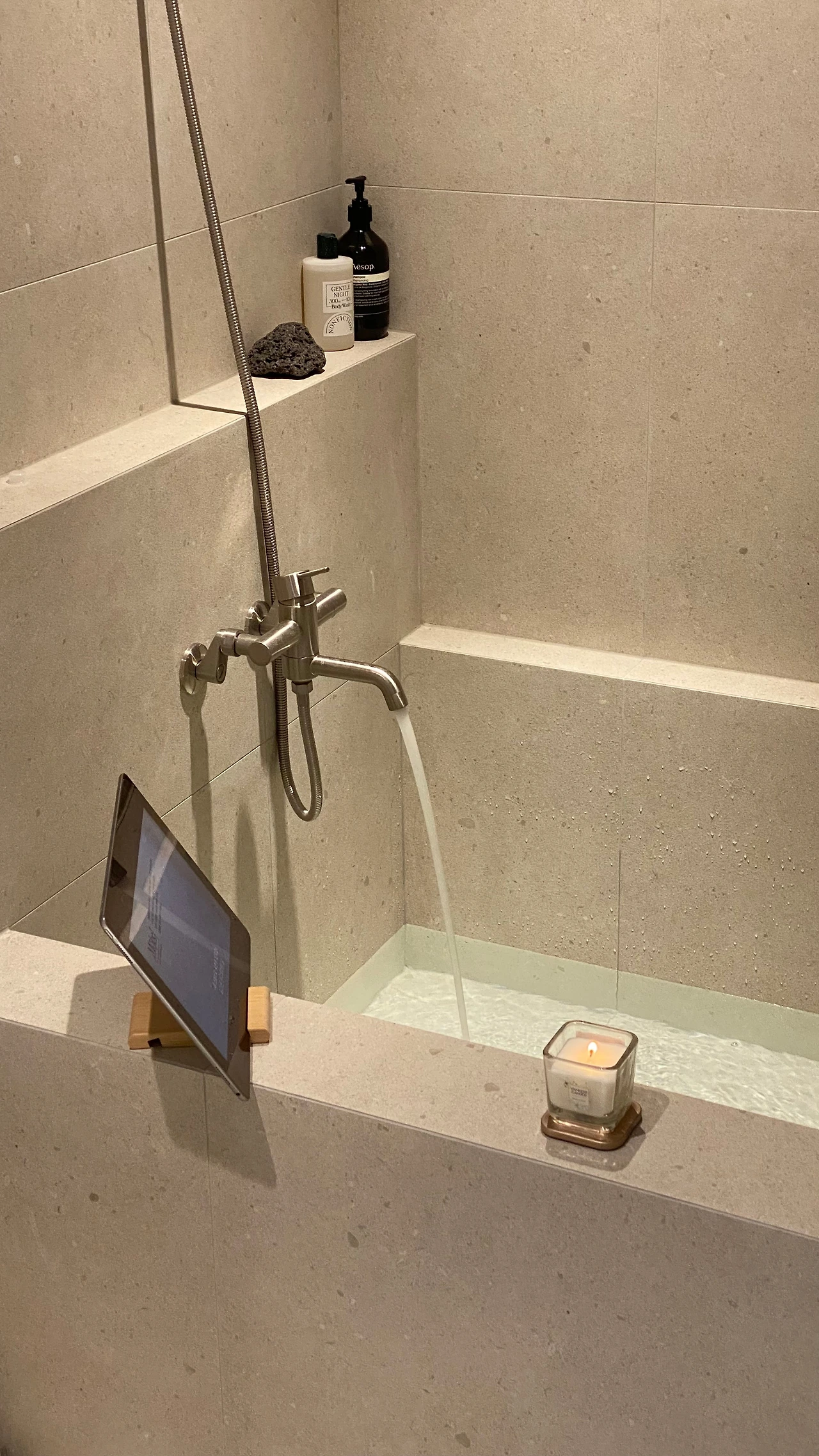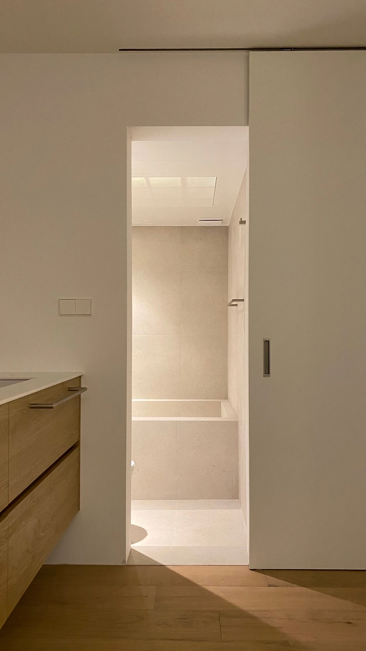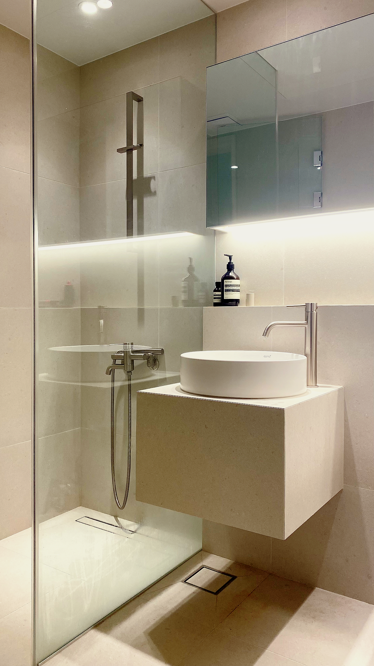 주방과 다이닝룸 다음으로 중요하게 생각한 곳은 화장실이었습니다. 기존에는 거실 화장실에 욕조가 있고, 안방 화장실에 샤워부스가 있었습니다. 하지만 저희는 아침에 일어나 주방에서 물을 마신 후 샤워를 하러 가고, 자기 전에 목욕을 하고 침대로 갑니다. 이러한 동선을 고려했을 때 샤워부스는 거실에 있고, 욕조는 안방 화장실로 가는 게 적절해 보였습니다. 또 욕조는 최대한 크게 만들고 싶었지만 안방 화장실은 그러기엔 너무 좁았어서 세면대를 밖으로 꺼내게 되었고, 습한 걸 싫어하는 저희는 두 화장실을 모두 건식으로 바꾸기로 했습니다. 그렇게 우리 집의 킬러 피처(?)인 조적 욕조가 탄생했고, 자기 전 세수와 양치를 할 수 있는 파우더룸도 만들어졌습니다.
