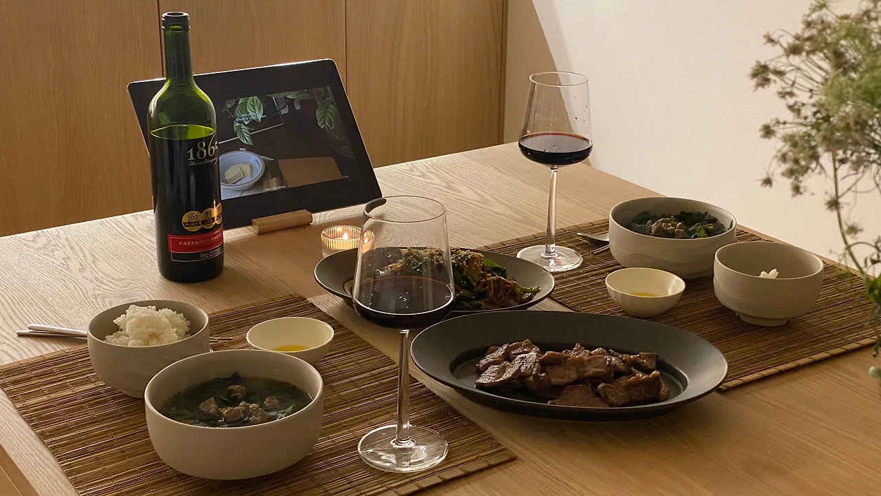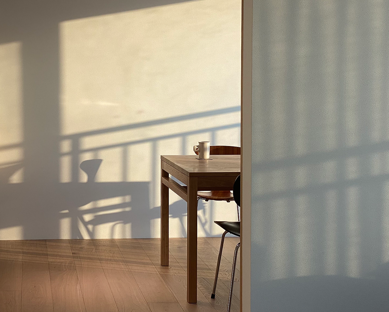 또 한쪽 방을 다이닝룸으로 사용하기로 하면서 우리가 원했던 큰 식탁을 둘 수 있게 되었습니다. 다만 주방과 다이닝룸 간의 동선이 멀어지는 점을 보완하기 위해 기존 방문은 막아버리고 주방 쪽 벽을 허물어 왔다 갔다 하기 좋은 넓은 문을 새롭게 만들었습니다. 방 하나를 온전히 ‘테이블'로 가득 채우는 과감한 결정을 할 수 있었던 이유는 우리의 생활패턴을 적어봤을 때 하루 중 가장 많은 시간을 보내는 곳이 바로 테이블이라는 점을 알 수 있었기 때문입니다. 재택근무를 하는 책상, 밥을 먹는 식탁, 커피를 마시는 테이블을 모두 따로 두어 공간을 나누기보다는 하나의 큰 테이블에서 모두 가능하게 만들어 동선을 최소화했습니다. 비슷한 기능을 하는 3개의 가구를 하나로 통합하는 것만으로도 집이 많이 넓어지고 깔끔해졌습니다.