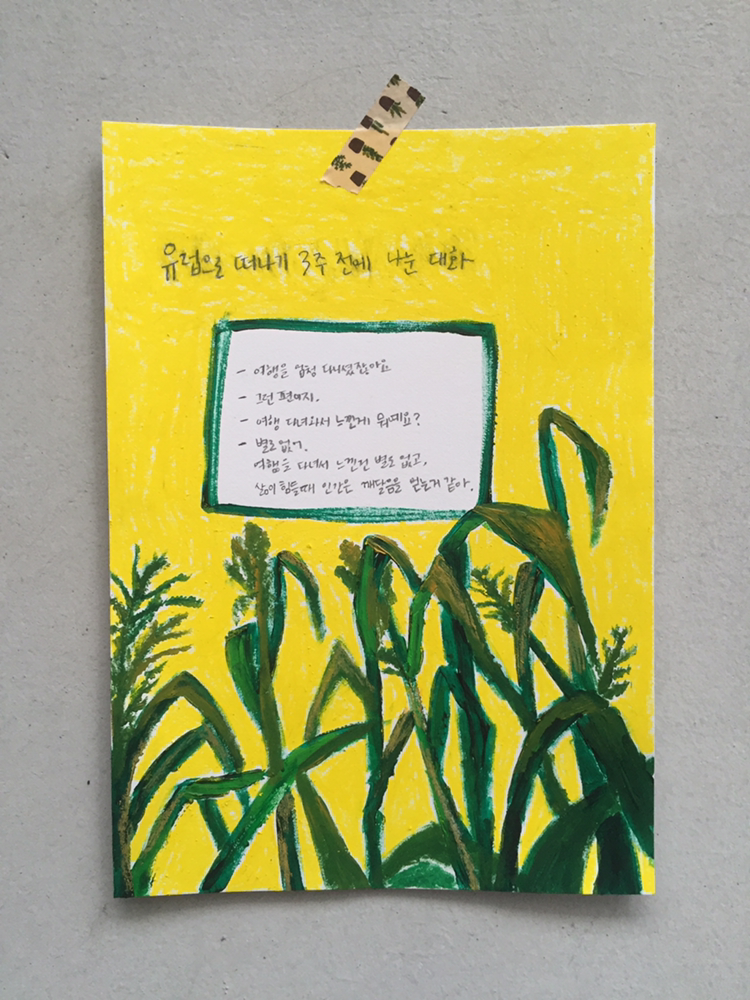 - 별로 없어. 여행을 다녀서 느낀 건 별로 없고, 삶이 힘들 때 인간은 깨달음을 얻는 거 같아.