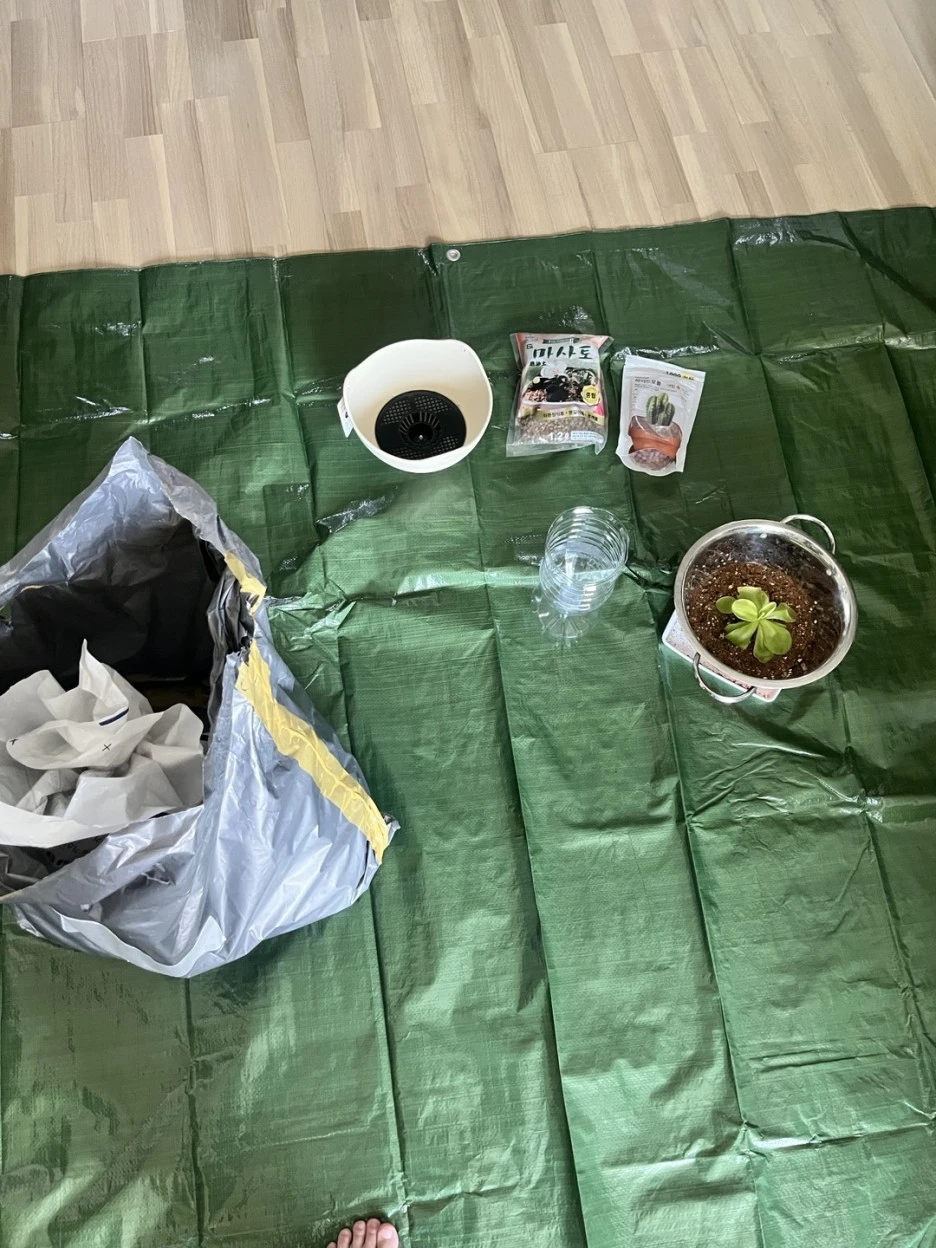 소생술이라봤자 대단한 것은 없습니다. 다이소에 가서 하이드로볼과 적당한 화분을 하나 사와서 옮겨담은 것 뿐입니다. 찾아보니 벌레잡이 제비꽃은 '수태'에서 잘 자란다고 합니다. 수태는 물이끼나 산이끼 등을 건조시킨 것을 말합니다. 다이소에 팔지 않으니 건너뜁니다. 대신 배수와 통기, 그리고 보습이 잘 되도록 상토 아래 하이드로볼을 깔아줬습니다. 유튜브 보니 남들은 항아리 뚜껑 같은 곳에 수태를 넉넉하게 깔아서 고급지게 키우고 있었지만 남들 하는 거 다 따라하면 가랑이가 찢어지는 법입니다.