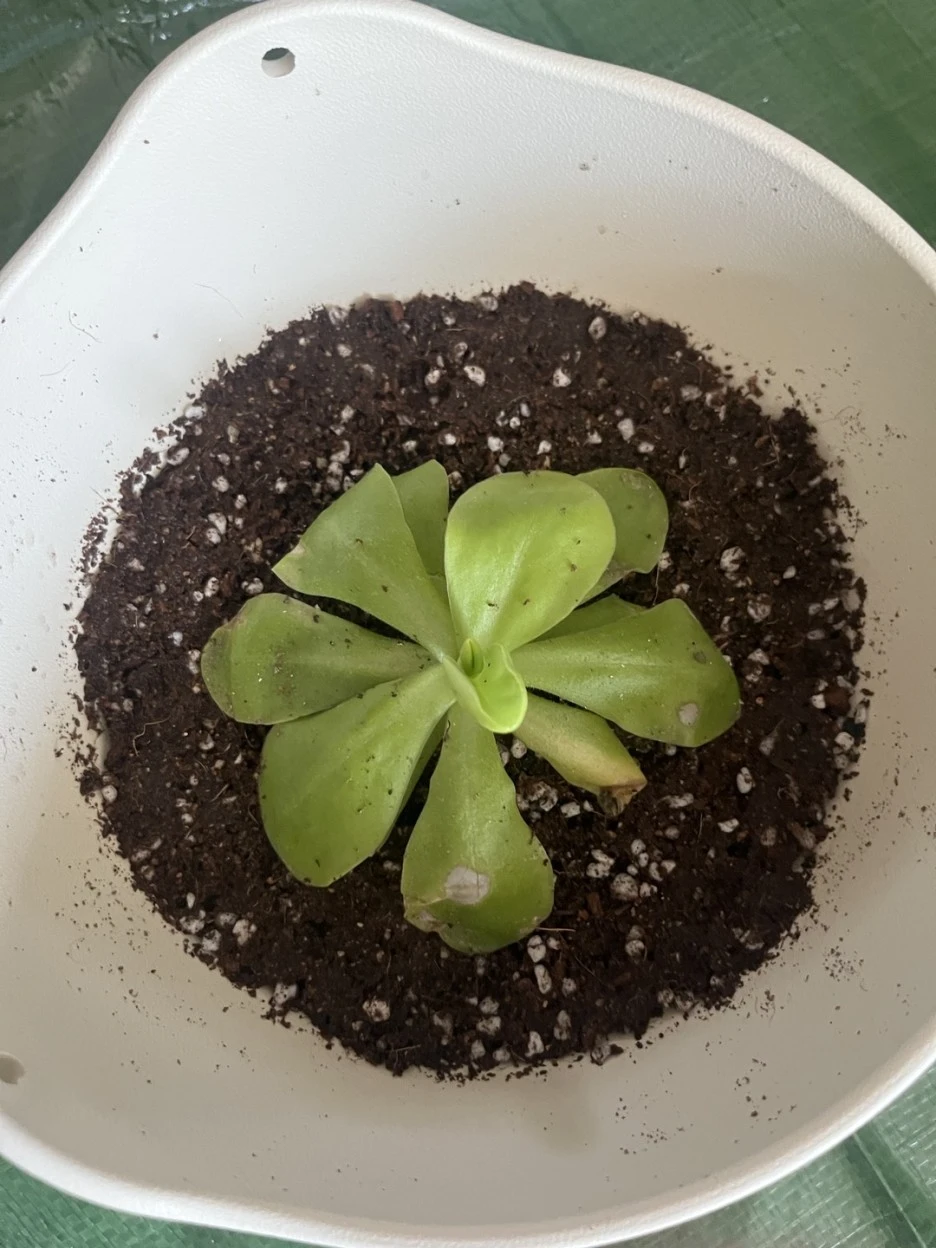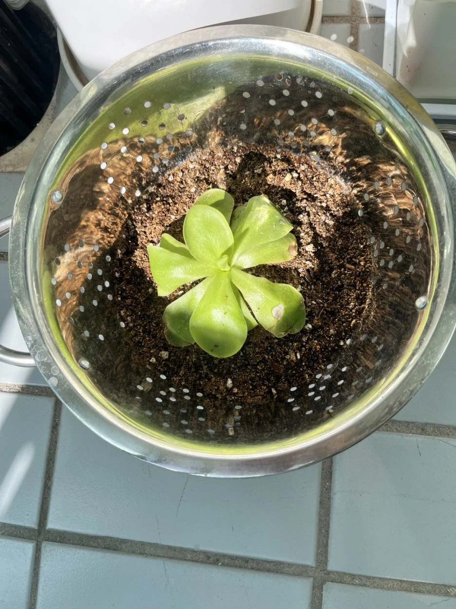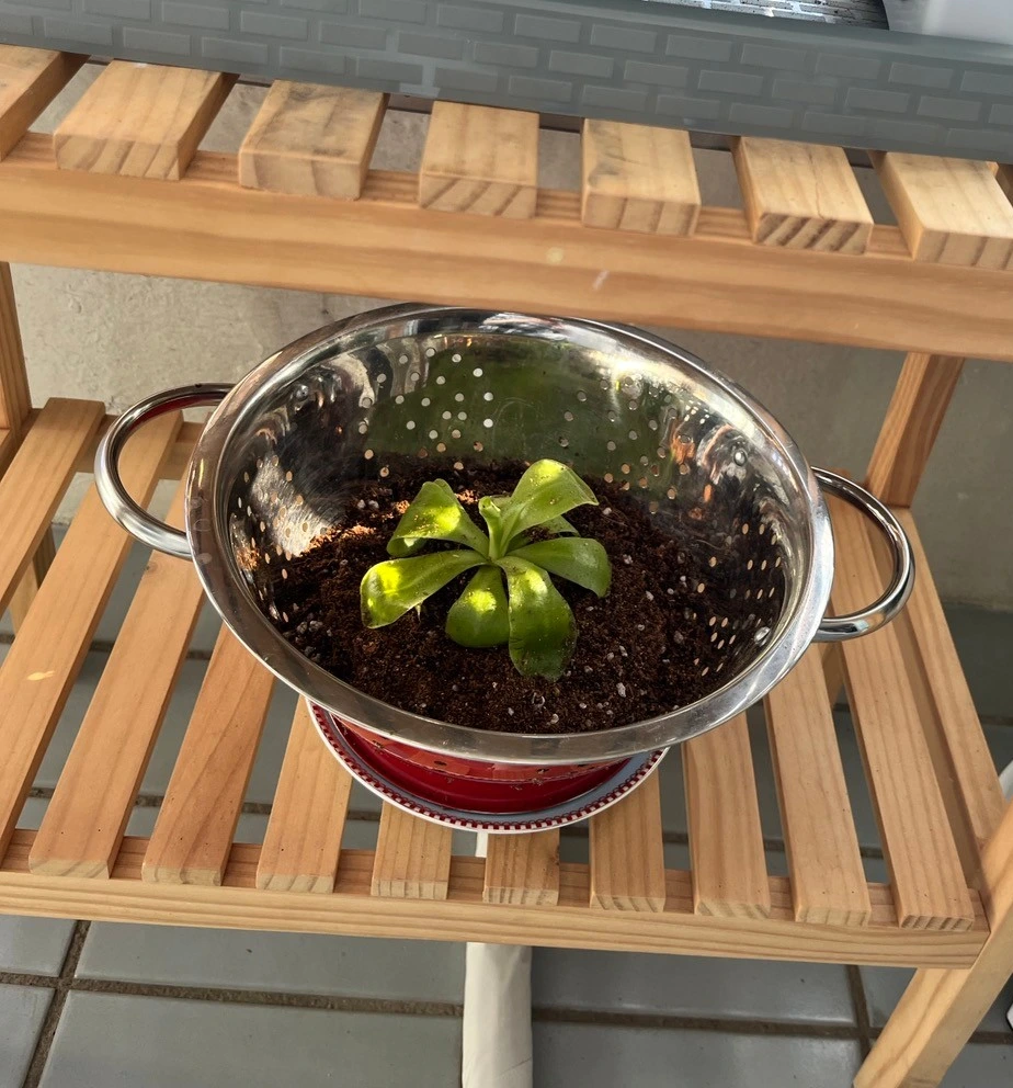 집에 와서 화분에 옮겨 심으려고 보니 적당한 화분이 없었습니다. 거기다 벌레잡이 제비꽃은 흙도 아닌 이상한 것에 심겨져 있었습니다. 나중에 그것이 수태라는 것을 알게 됐습니다. 화분도 없는데 그런 게 집에 있을리가 없습니다. 인터넷을 찾아보니 벌레잡이제비꽃은 습지에서 자생한다고 나와 있었습니다. 상토에 심어 습하게 키우면 되겠지,라고 생각해서 대충 채반에 상토를 채워 옮겨 심은 다음 그늘에 두었습니다. 그랬더니 불쌍한 녀석이 하루가 다르게 병들어 갔습니다.