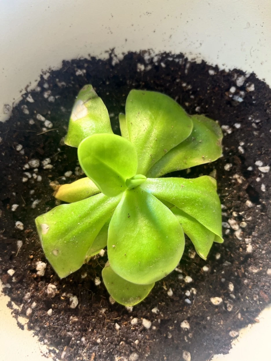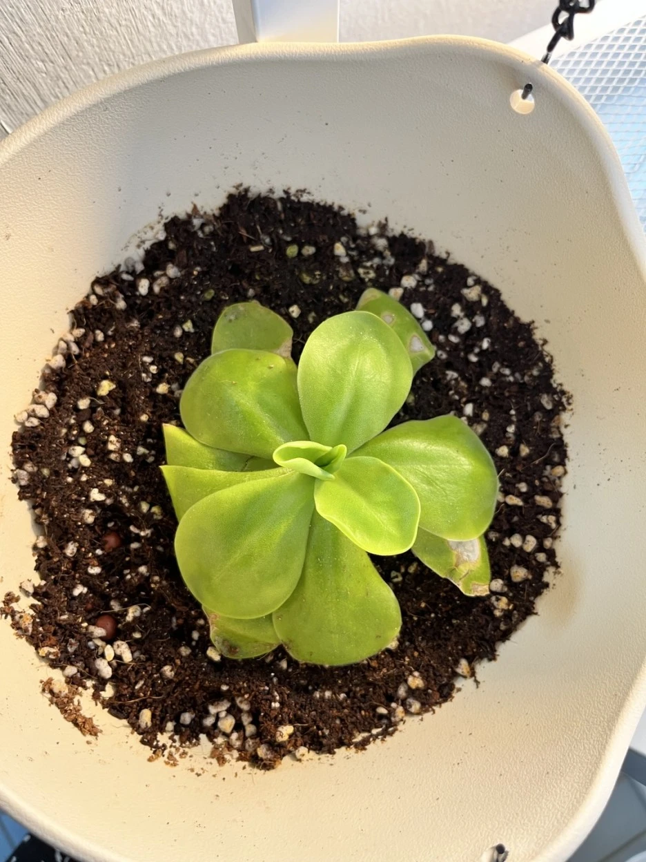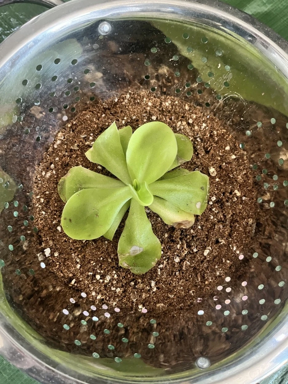집에 와서 화분에 옮겨 심으려고 보니 적당한 화분이 없었습니다. 거기다 벌레잡이 제비꽃은 흙도 아닌 이상한 것에 심겨져 있었습니다. 나중에 그것이 수태라는 것을 알게 됐습니다. 화분도 없는데 그런 게 집에 있을리가 없습니다. 인터넷을 찾아보니 벌레잡이제비꽃은 습지에서 자생한다고 나와 있었습니다. 상토에 심어 습하게 키우면 되겠지,라고 생각해서 대충 채반에 상토를 채워 옮겨 심은 다음 그늘에 두었습니다. 그랬더니 불쌍한 녀석이 하루가 다르게 병들어 갔습니다.