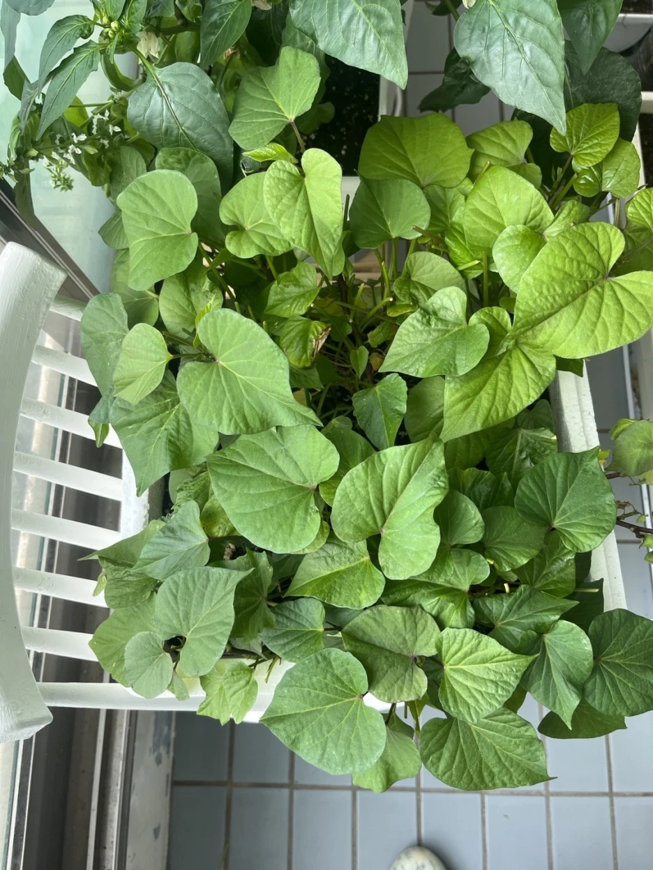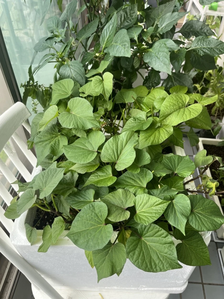 4. 고구마는 파프리카 옆에 있습니다. 고구마를 궁금해하셔서 한 번 찍어보았습니다. 고구마는 한 알만 심어도 스티로폼 박스를 다 덮는 기세로 자랍니다. 정말 무서운 녀석입니다.