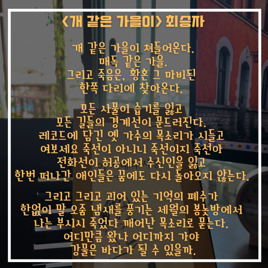 그러나 이번엔 너무 늦게 내쳐졌으니, 가을 시나 읽으며 상처받은 마음을 달래야겠습니다.
