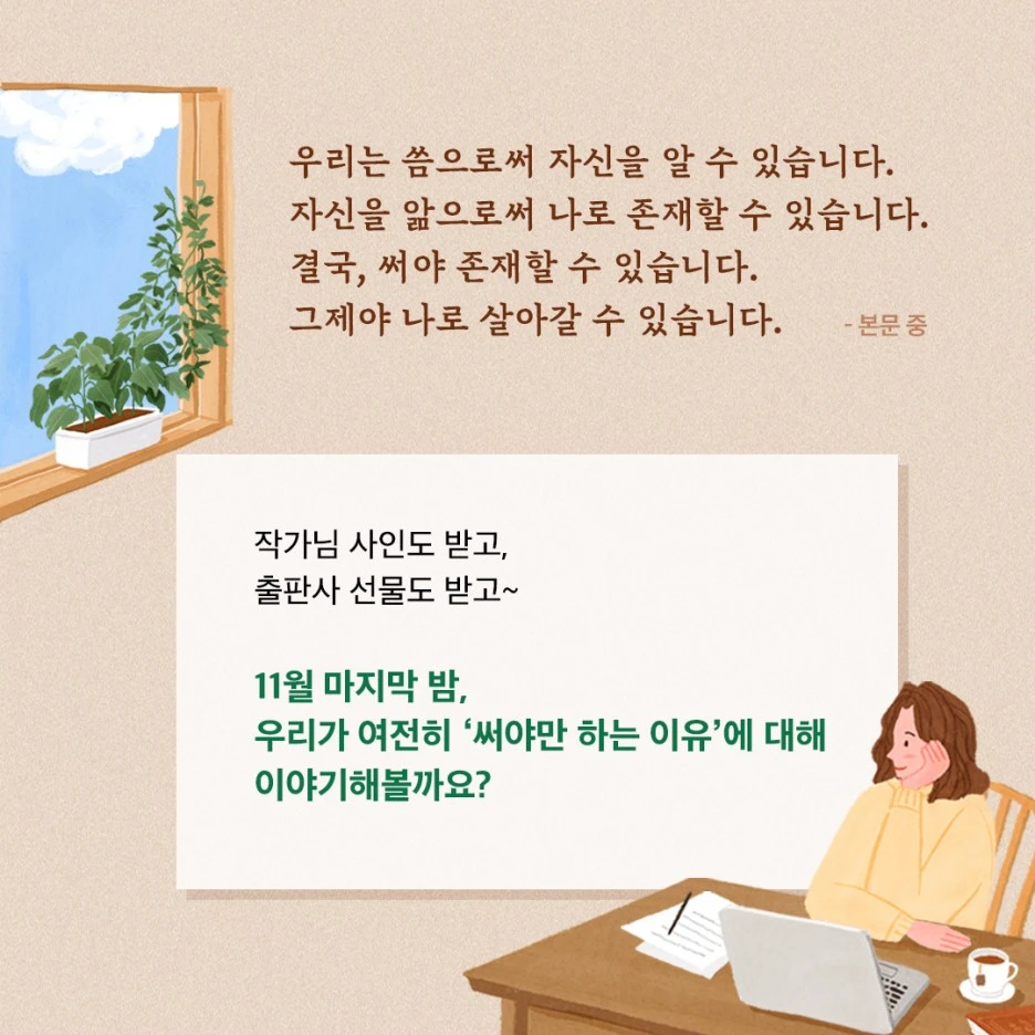 글쓰기 방법도 구체적으로 담았고 중간중간 웃기기까지 합니다... 라고 호기롭게 썼으나 내심은 북토크 자리를 못 채울까봐 덜덜 떠는 중입니다.