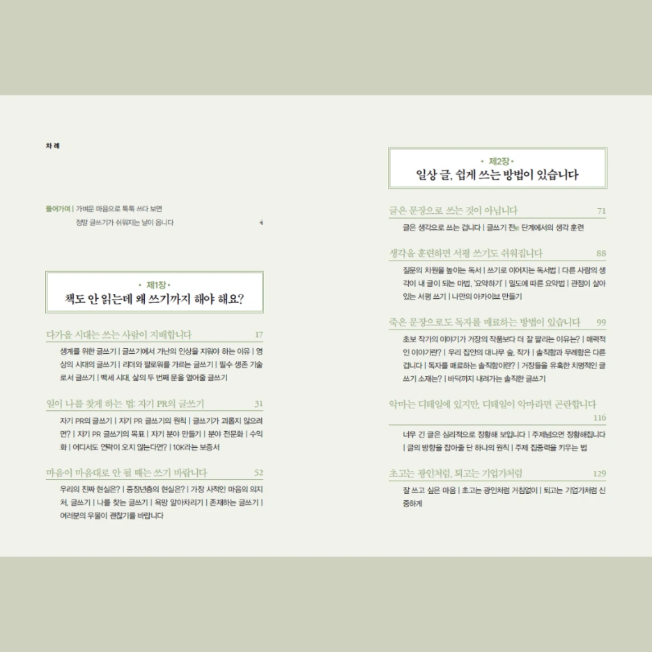 2장에서는 글감과 생각 훈련, 매력적인 구성 등 구체적인 글쓰기 방법을 알려드립니다. 3장은 이렇게 배운 글쓰기의 실전 편이라고 생각하시면 됩니다. 자기소개서, 보고서, 업무 메일 등 실용 글을 잘 쓰는 방법을 말씀드립니다.