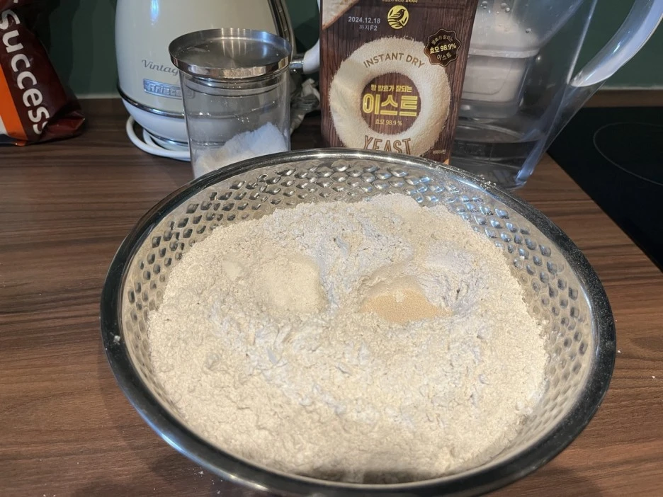 보울에 호밀가루와 소금과 이스트를 넣고(소금과 이스트를 같이 섞지 말고 사진에서처럼 두 구덩이를 파서 넣으십쇼. 이유는 묻지 마시고.)