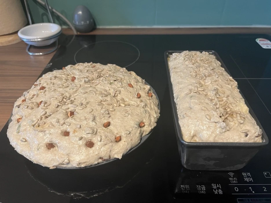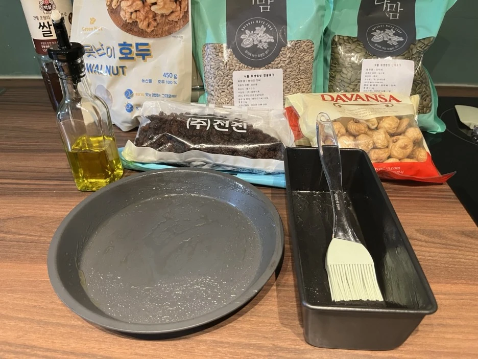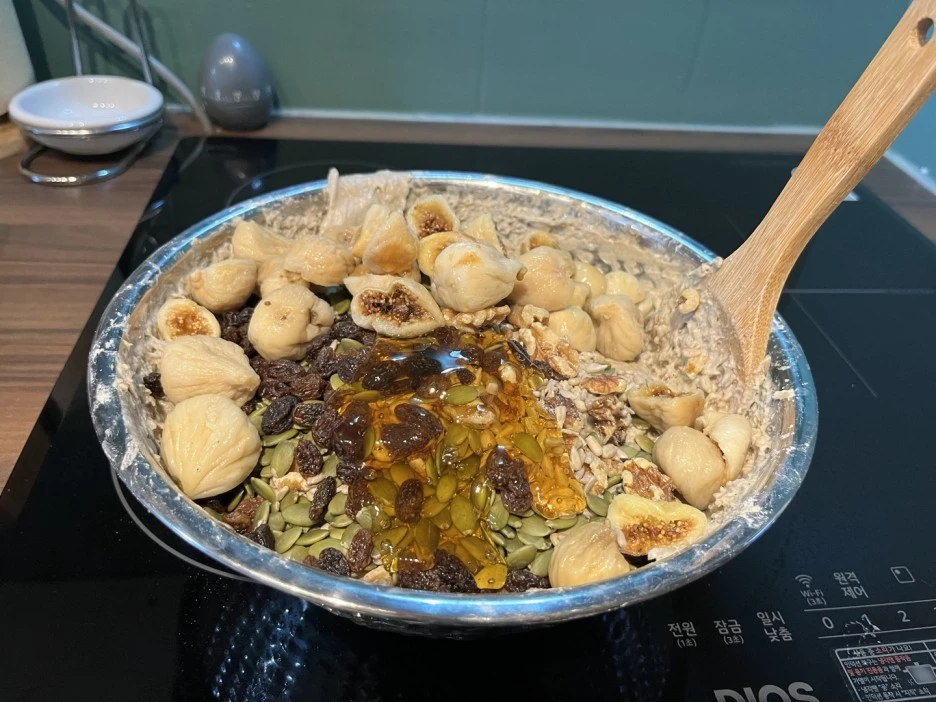 저는 욕심이 사나운 편이라 견과는 호두와 해바라기씨와 호박씨와 아몬드를 넣었고, 말린 과일은 무화과와 건포도를 넣었습니다.