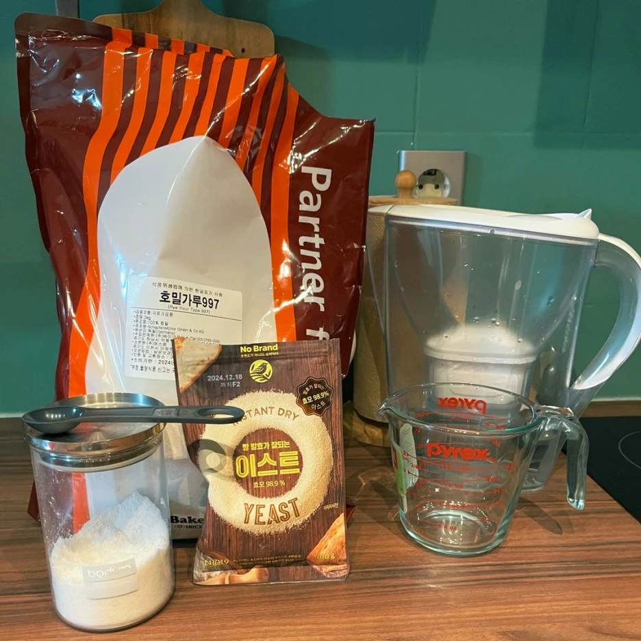 먼저 호밀가루는 997을 사면 됩니다. 독일 친구들이 만든 건데, 시중 호밀빵을 보면 997을 가장 많이 씁니다. 독일인들이 만든 것은 믿어도 됩니다.
