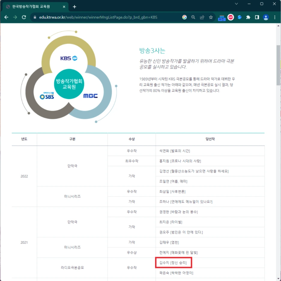 바로, 2021년 라디오극본공모 우수상 수상자에 제 이름이 들어가 있는 명단입니다.