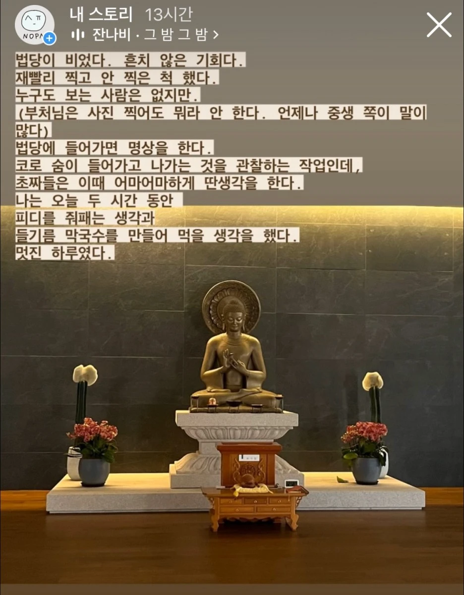 차갑고 두꺼운 이불을 뒤집어쓴 듯한 기분으로, 온몸으로 침묵을 체감하며, 저는 불상 앞에 조용히 방석을 깔고 앉았습니다.